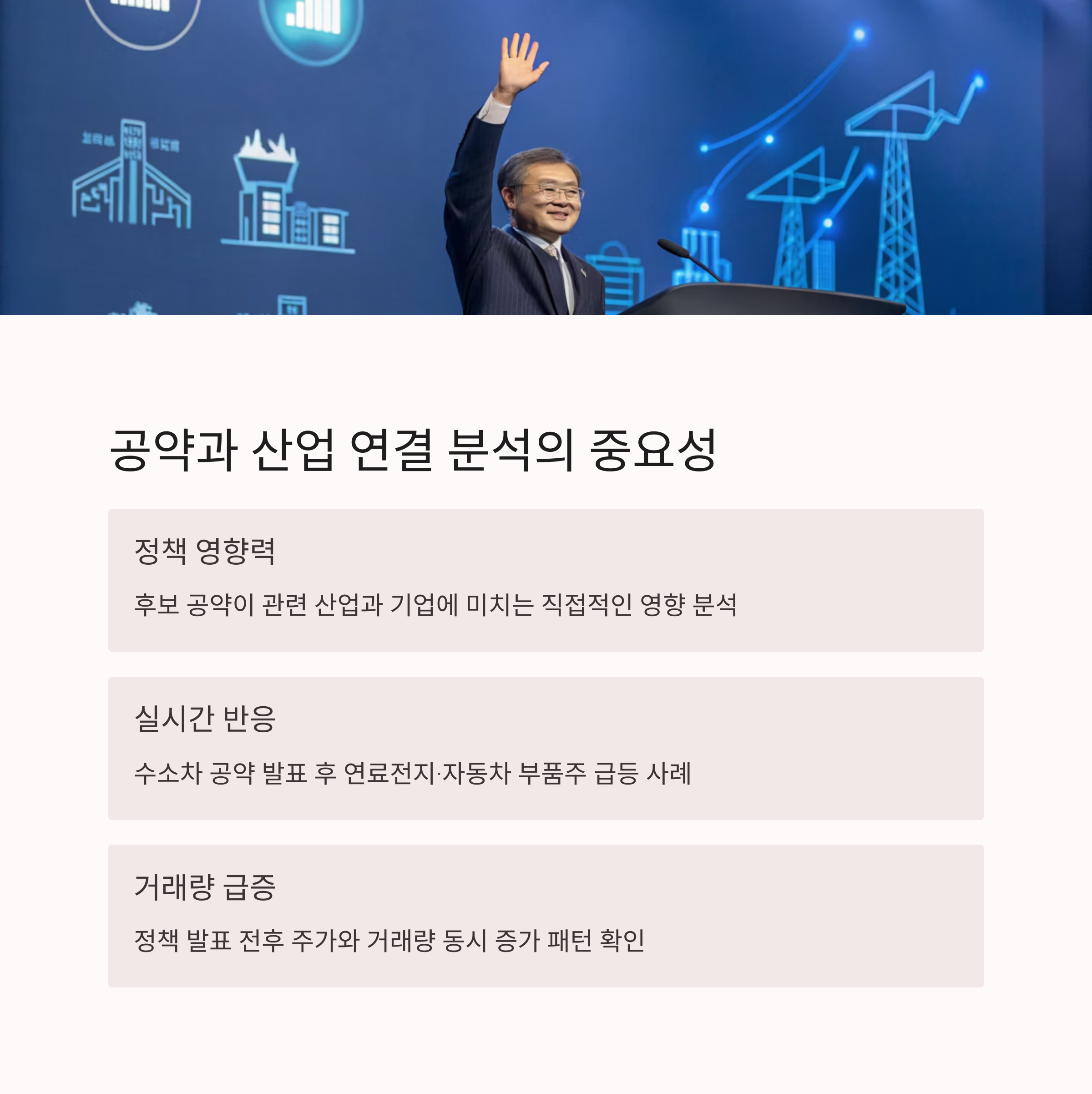 | 후보, 정책, 산업 키워드 모니터링 필요 | 이동평균선, 거래량 급증 여부 확인 | 주요 산업군과 후보 공약 교차 분석 필요 |