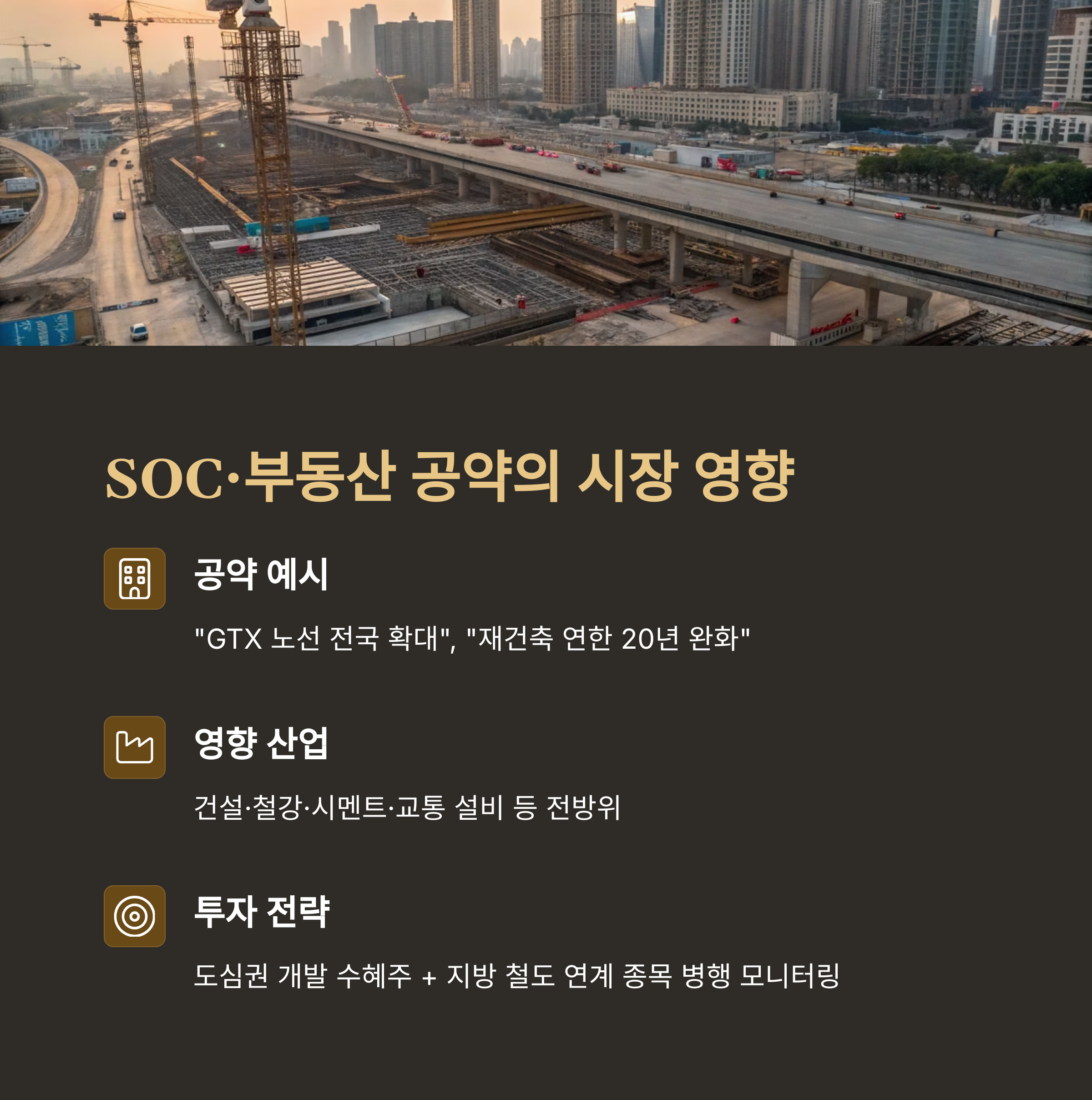 - 공약 예시: “GTX 노선 전국 확대”, “재건축 연한 20년 완화”