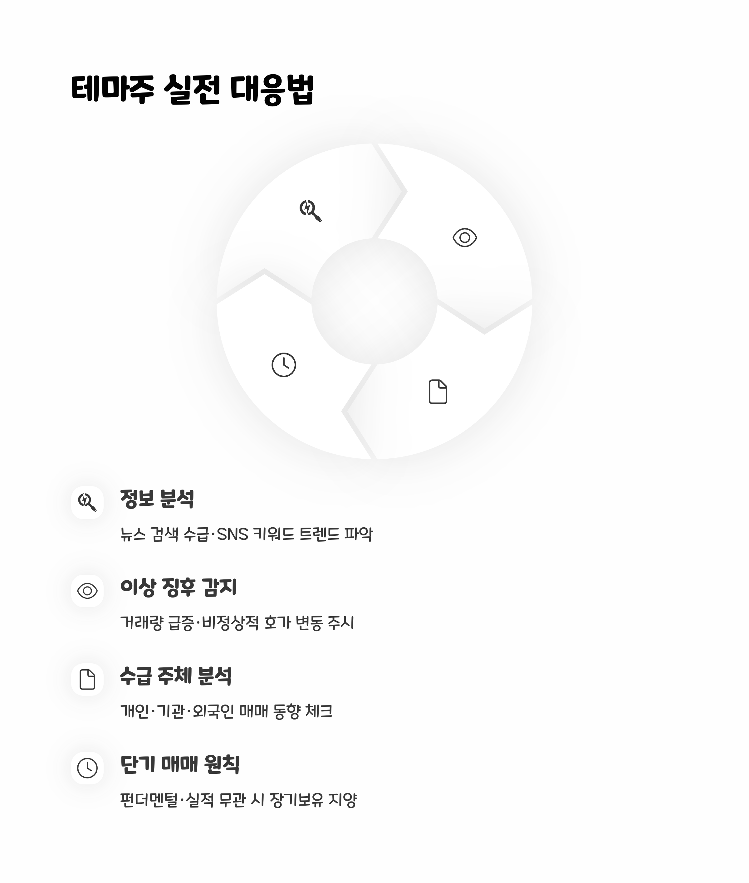 테마주의 흐름은 매우 짧고 강합니다. 따라서 단기적 수익을 목적으로 접근하는 것이 맞습니다. 장기적인 투자 관점에서는 높은 변동성과 이슈 의존도로 인해 리스크가 클 수밖에 없습니다. 이럴 때는 반드시 기술적 분석과 뉴스 흐름을 병행하여 접근하고, 손절 기준을 명확히 설정해두는 것이 중요합니다.