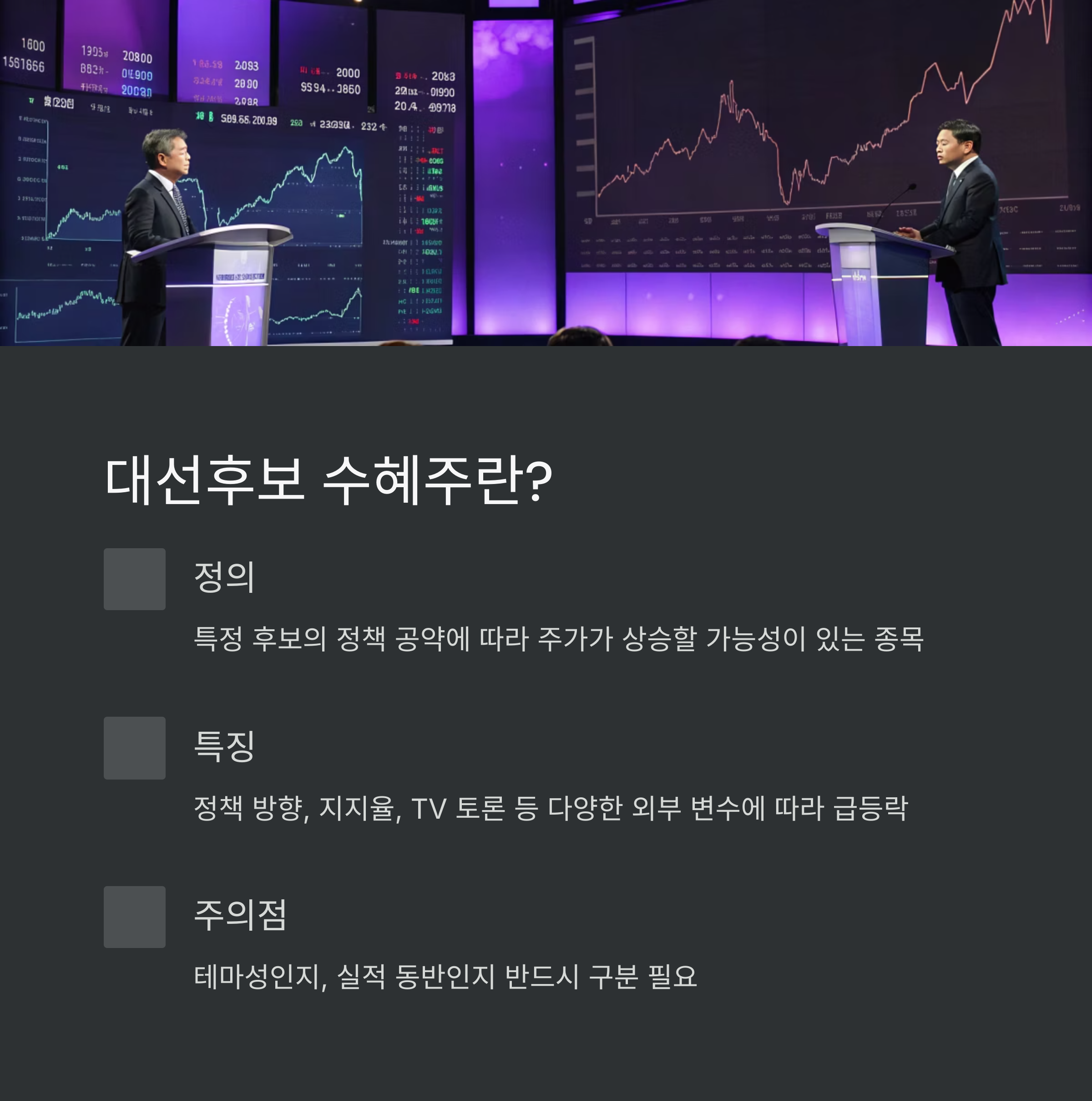 대선테마주, 대선수혜주, 정책테마, 지지율관련주, 공약수혜종목, 단기매매전략