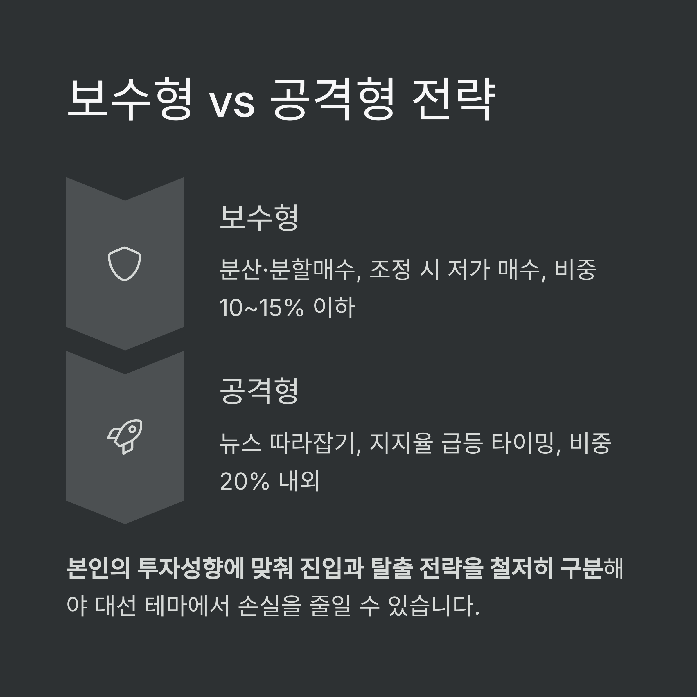 | 공격형 | 뉴스 따라잡기 | 지지율 급등 타이밍 | 20% 내외 단기 트레이딩 |