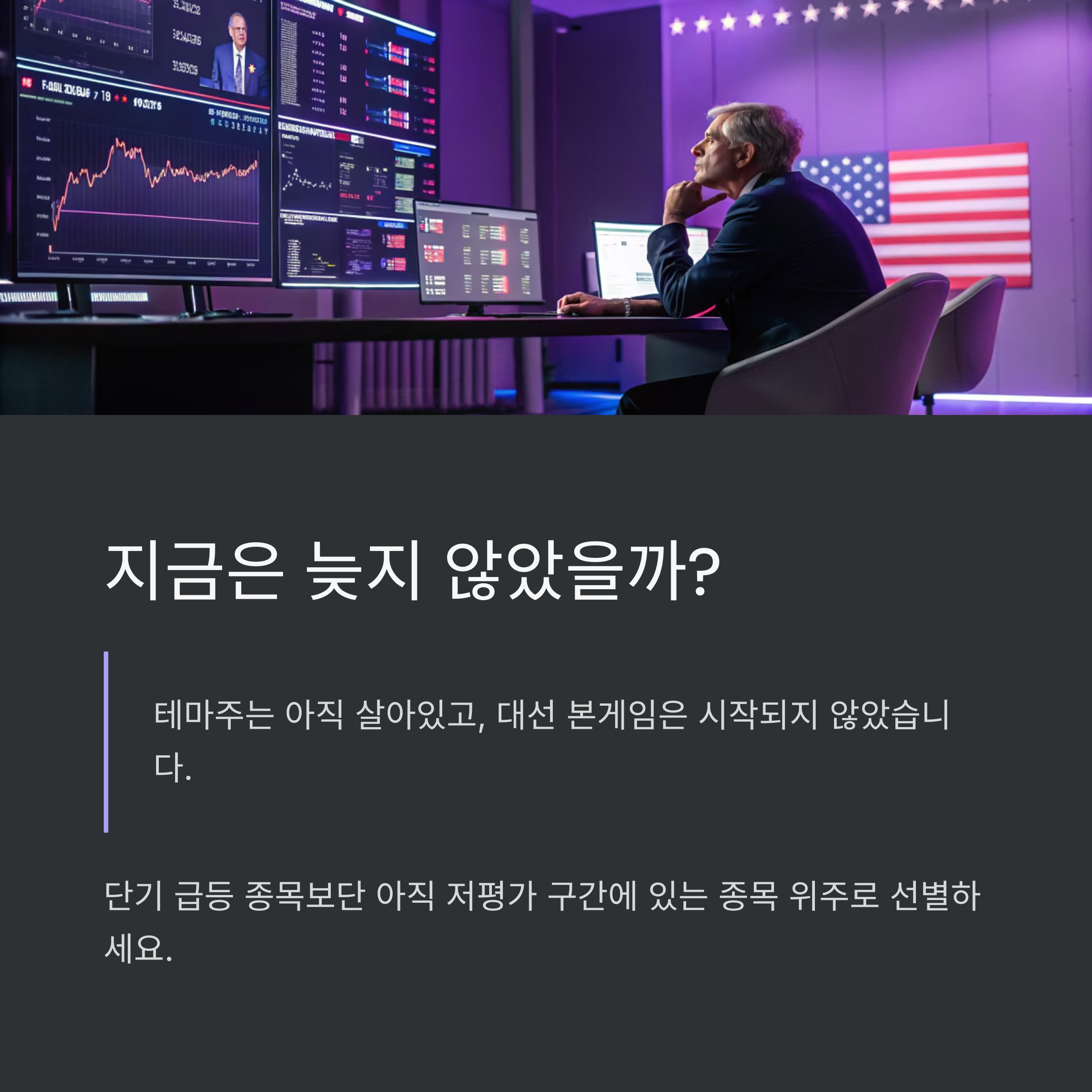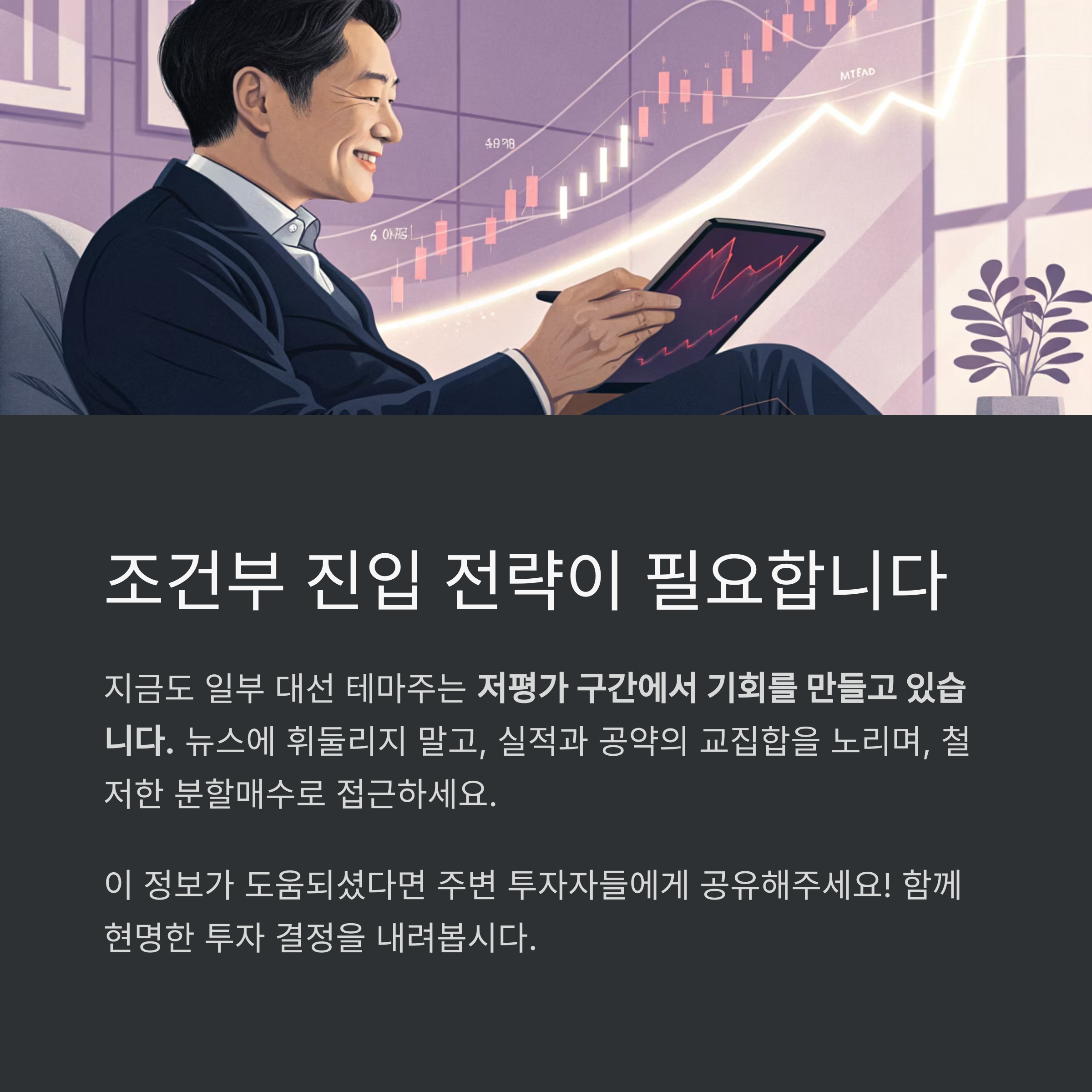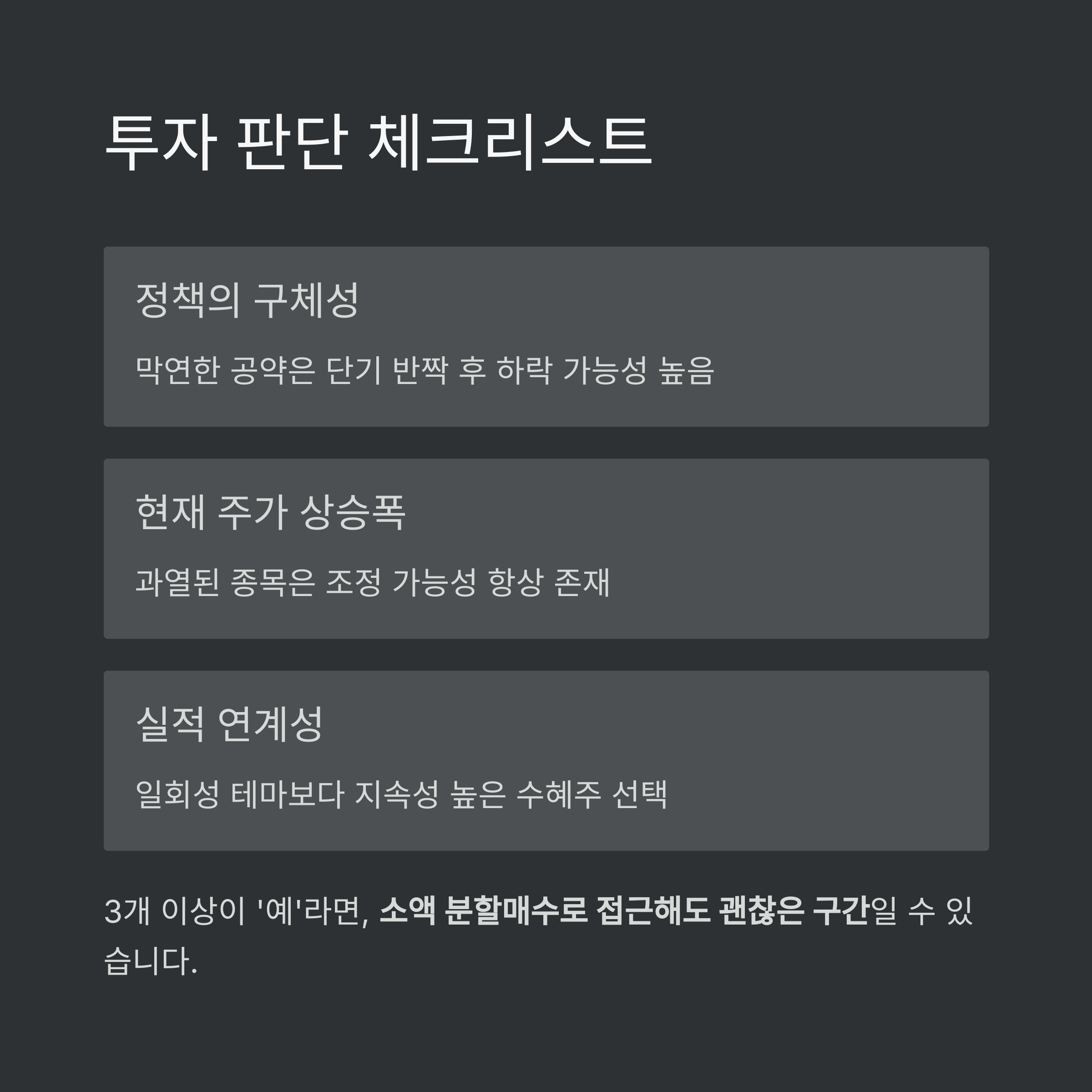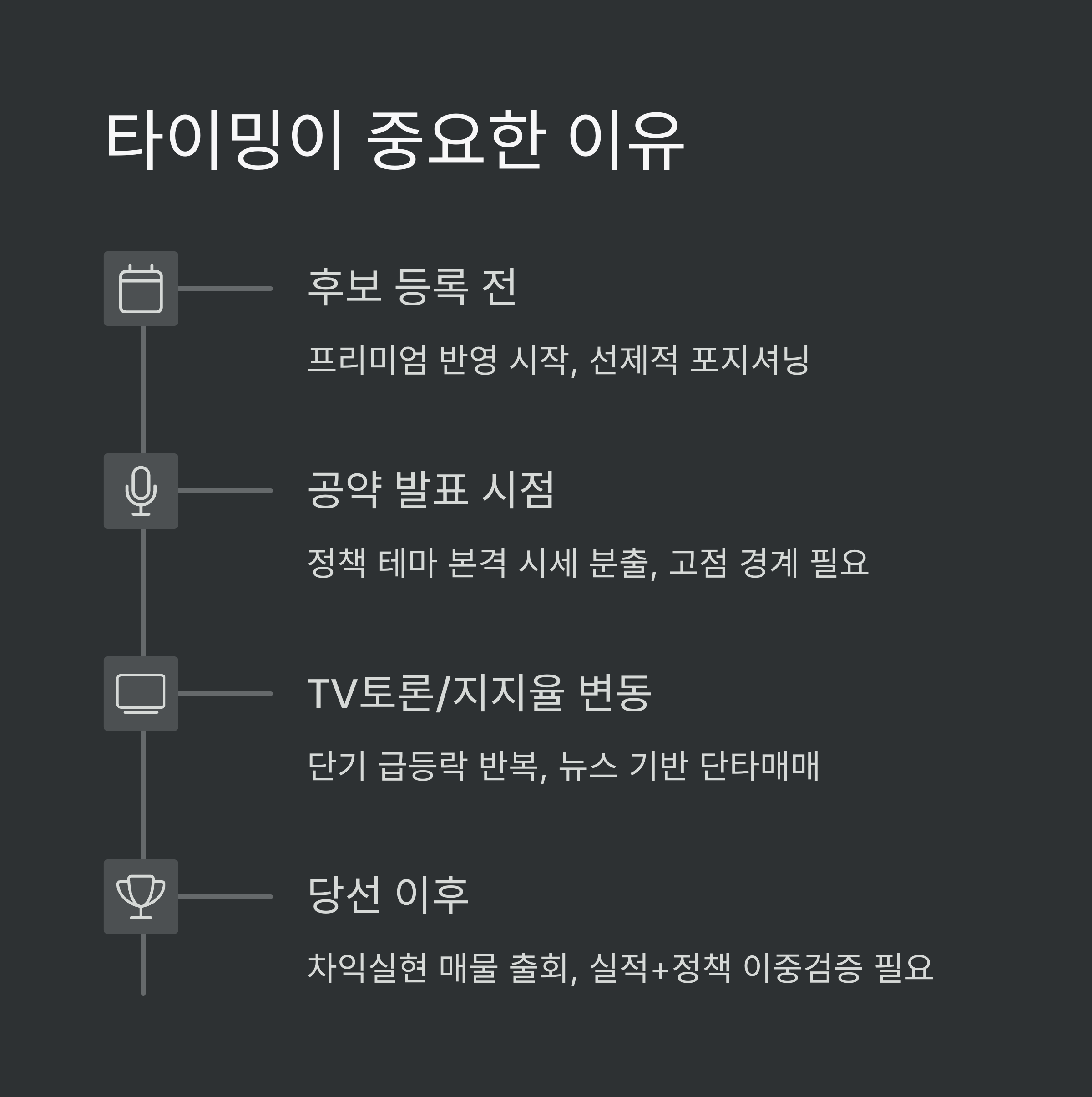 | 당선 이후 | 차익실현 매물 출회 가능 | 실적+정책 이중검증 필요 |