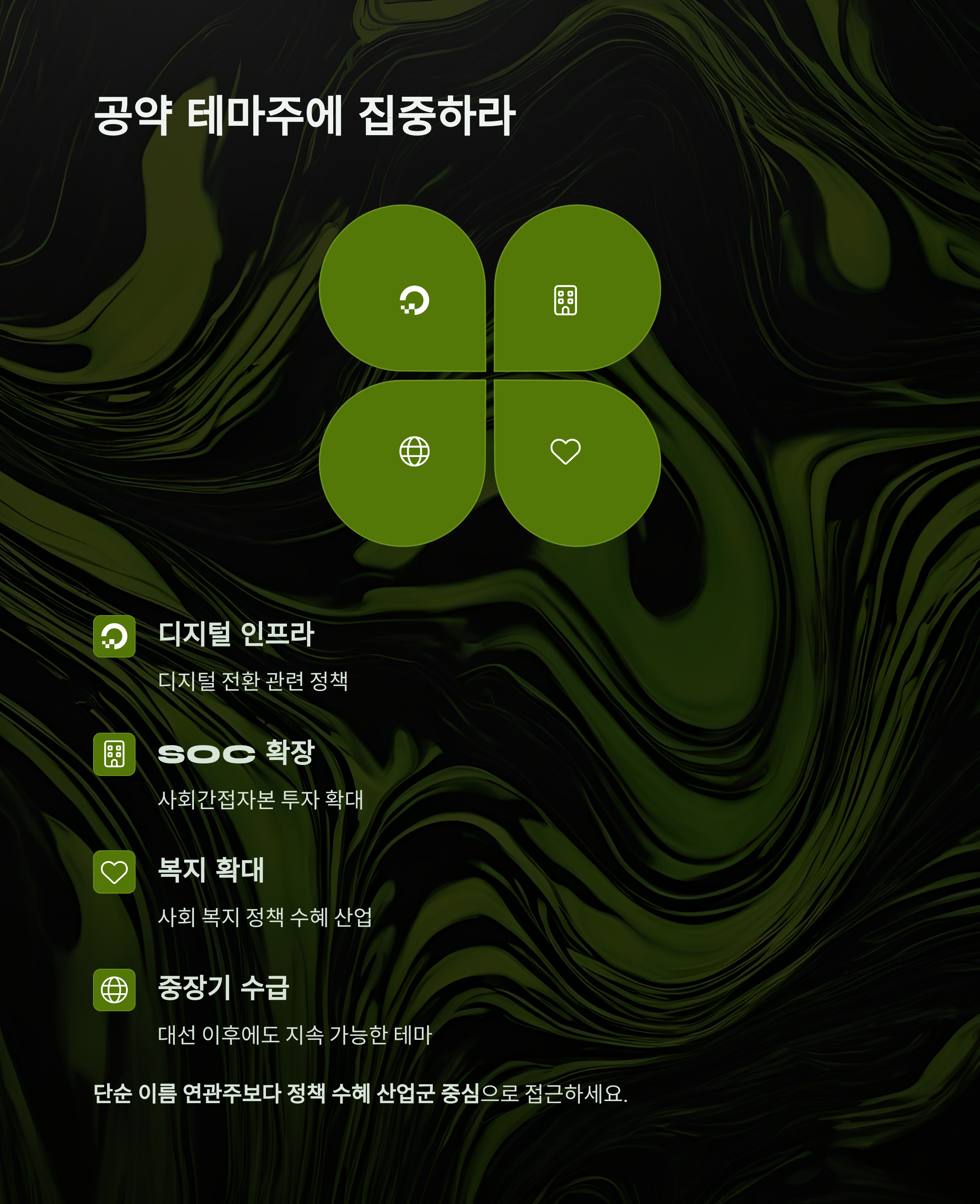 | 뉴스 흐름 | 신규 공약 발표 유무 | 모멘텀 유지 여부 판단 |
