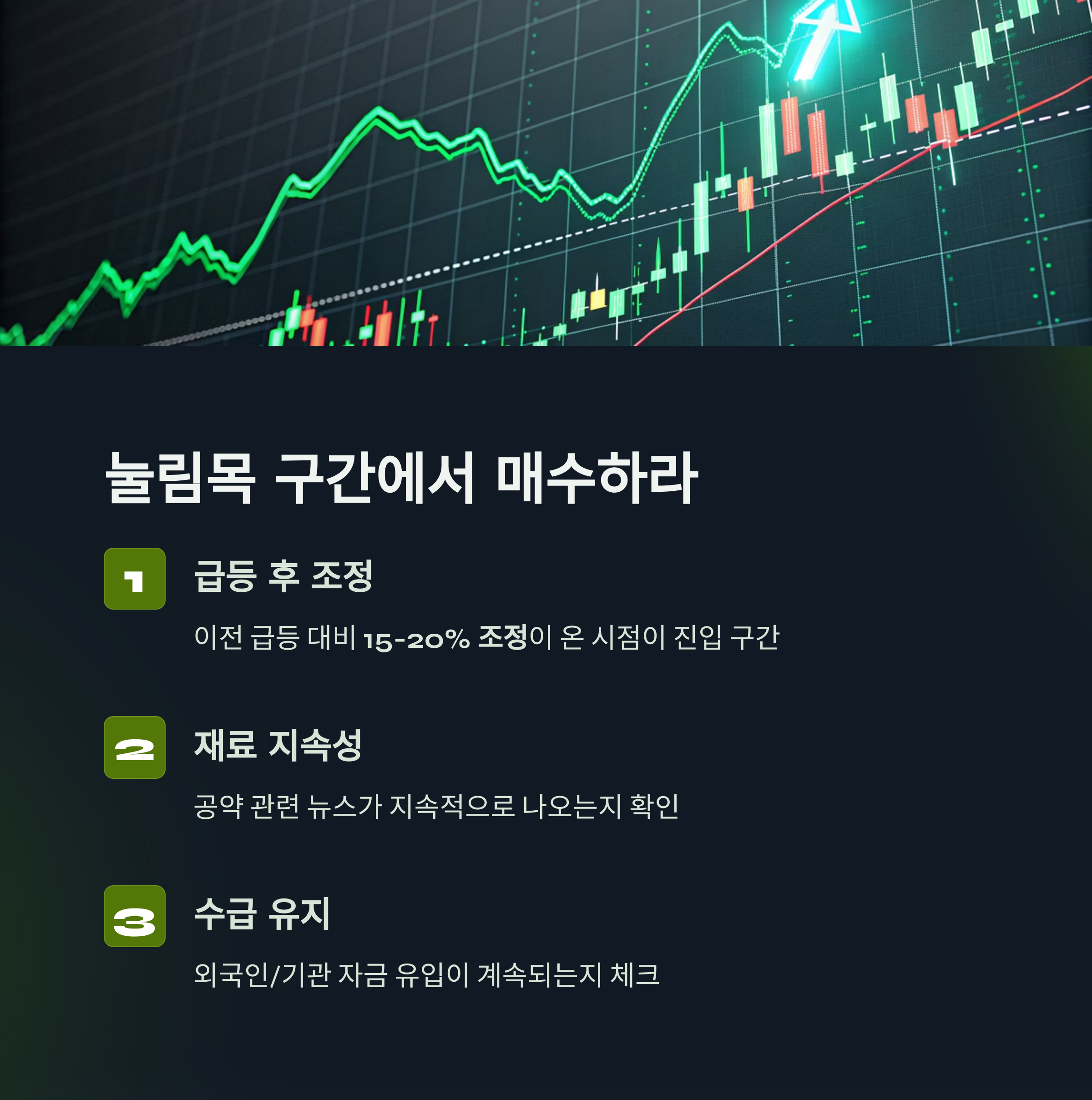 핵심은 급등 직후 진입이 아니라, 조정 후 반등 포착입니다.