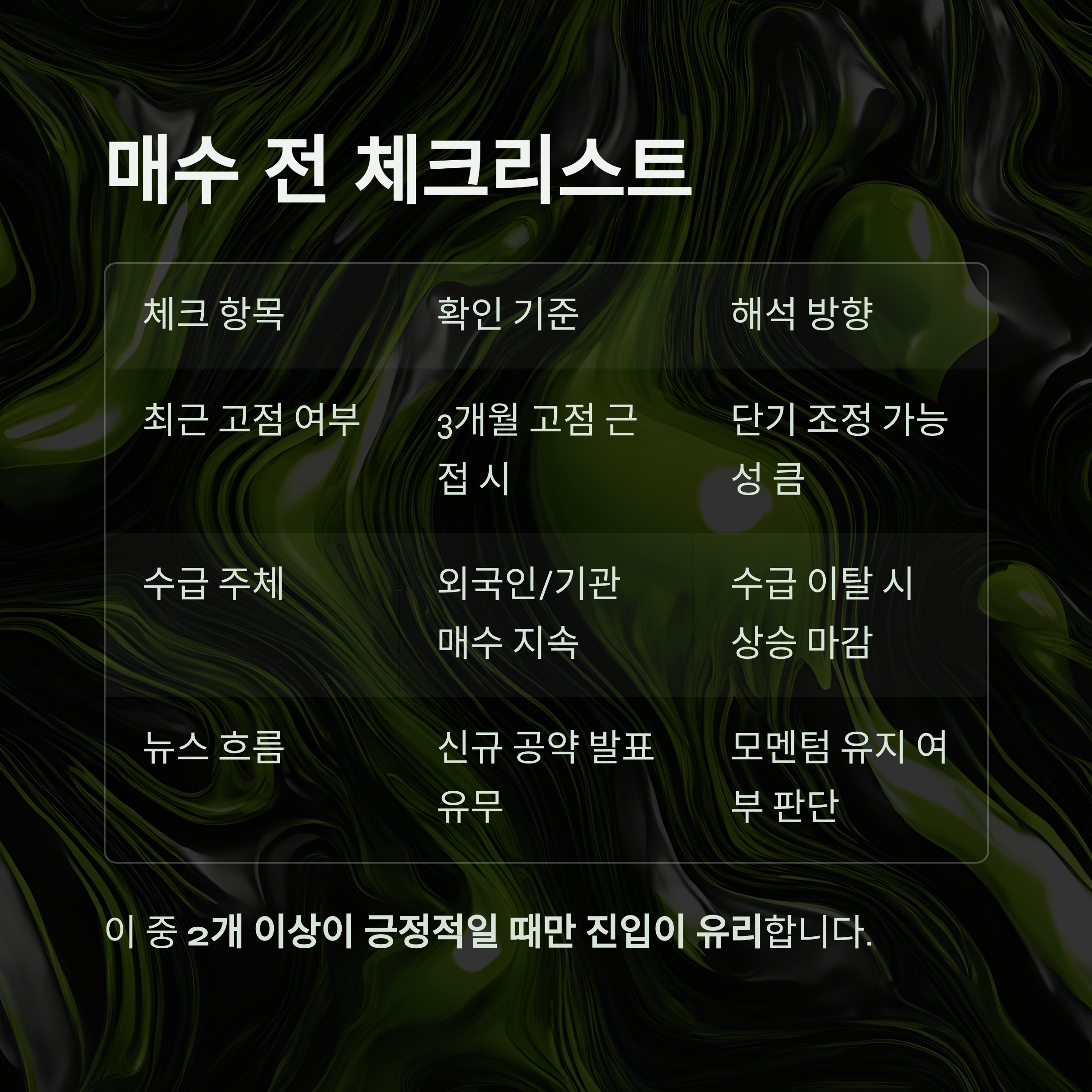 | 최근 고점 여부 | 3개월 고점 근접 시 | 단기 조정 가능성 큼 |