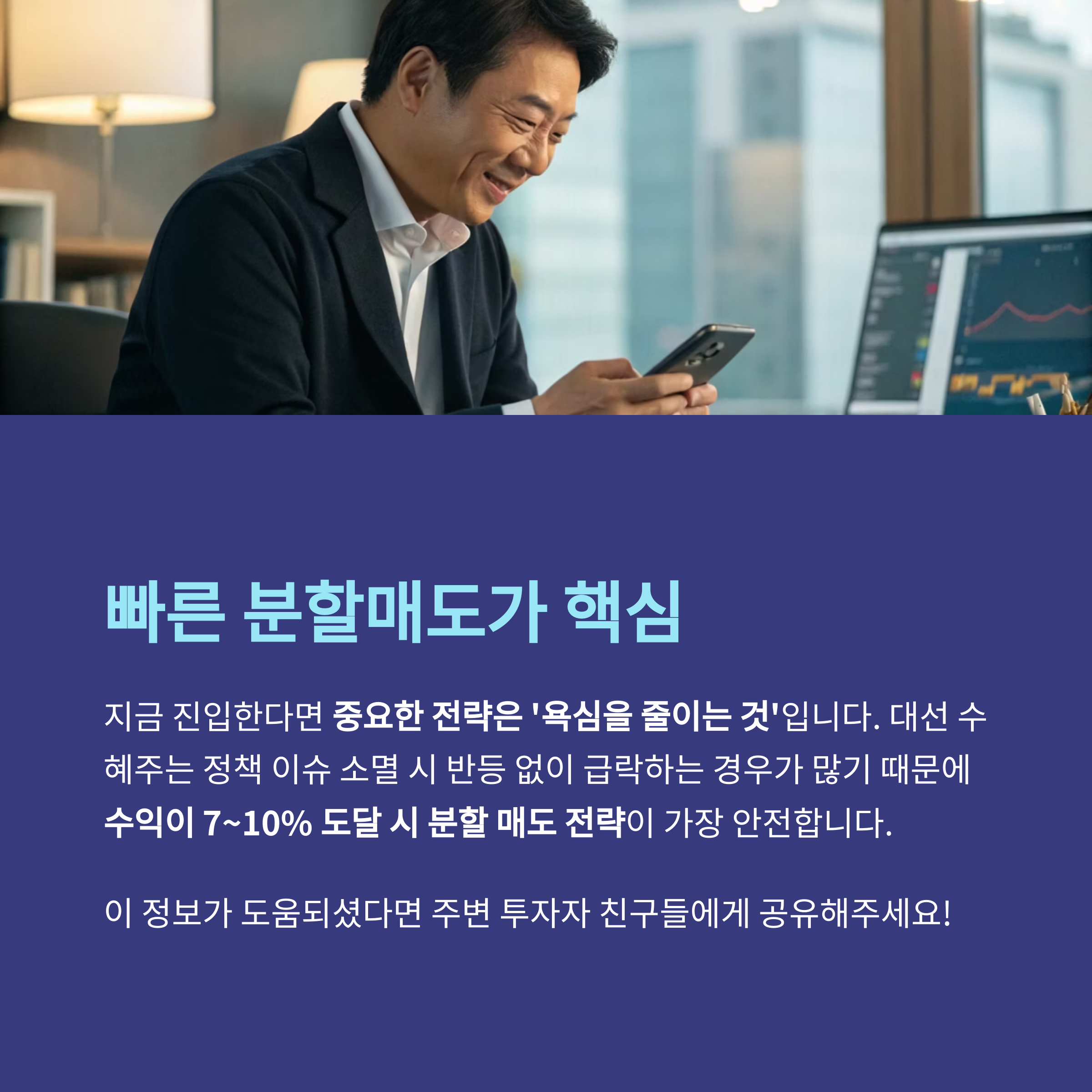 수익이 7~10% 도달 시 분할 매도 전략이 가장 안전합니다.