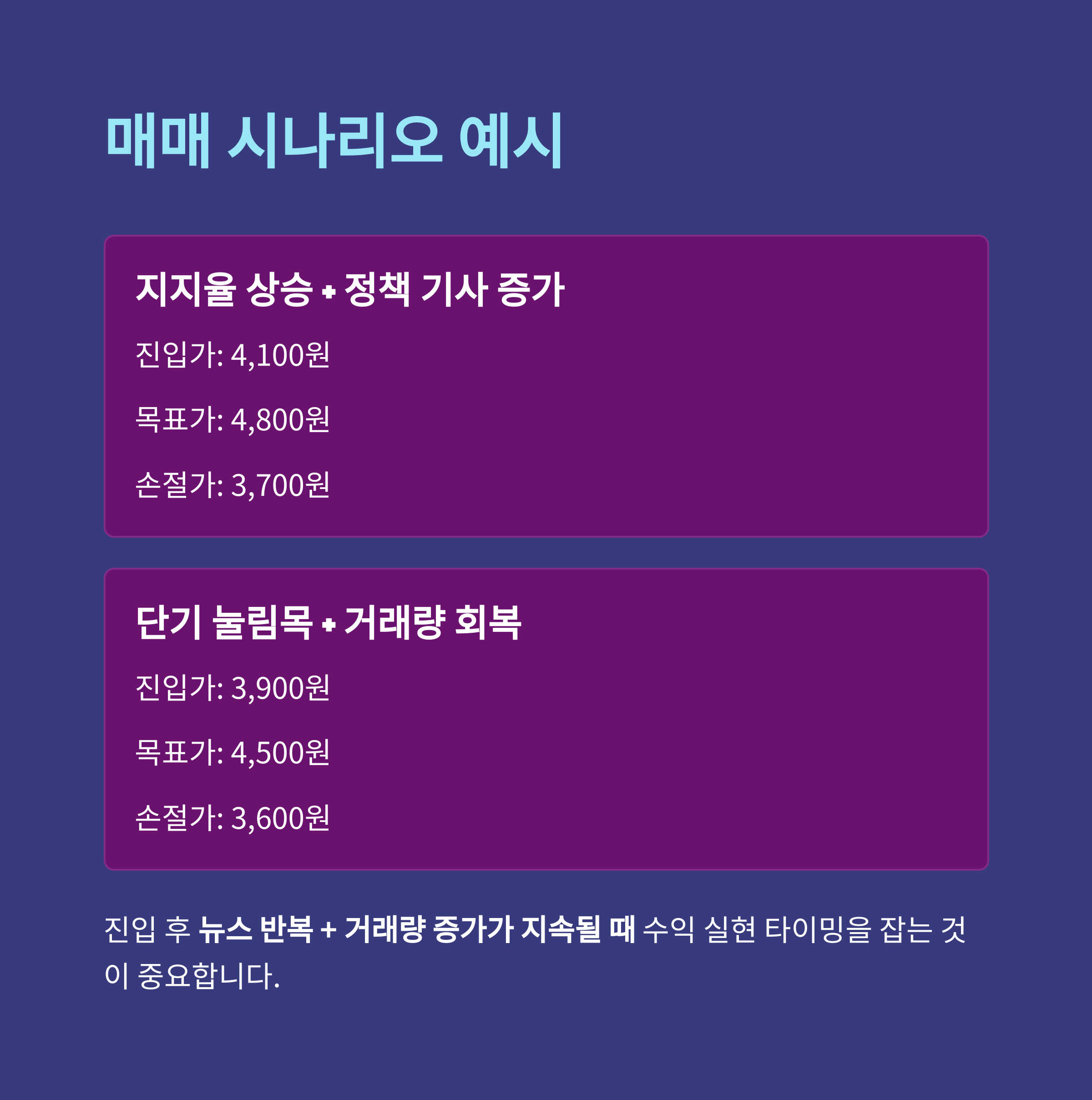 | 지지율 상승 + 정책 기사 증가 | 4,100원 | 4,800원 | 3,700원 |