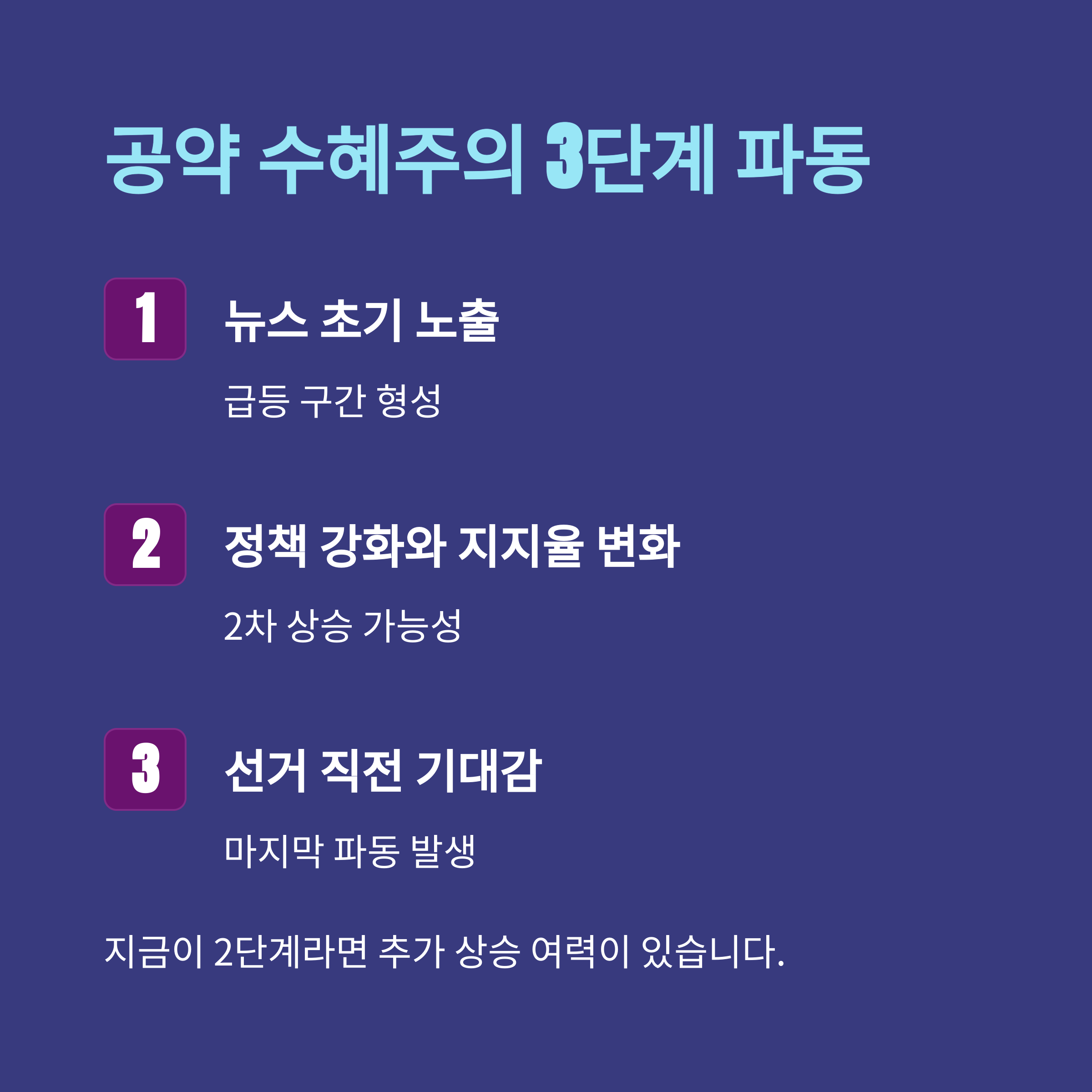 또한 공약이 발표된 지 3일 이상 지나고 후속 보도가 없다면 고점일 가능성이 큽니다.