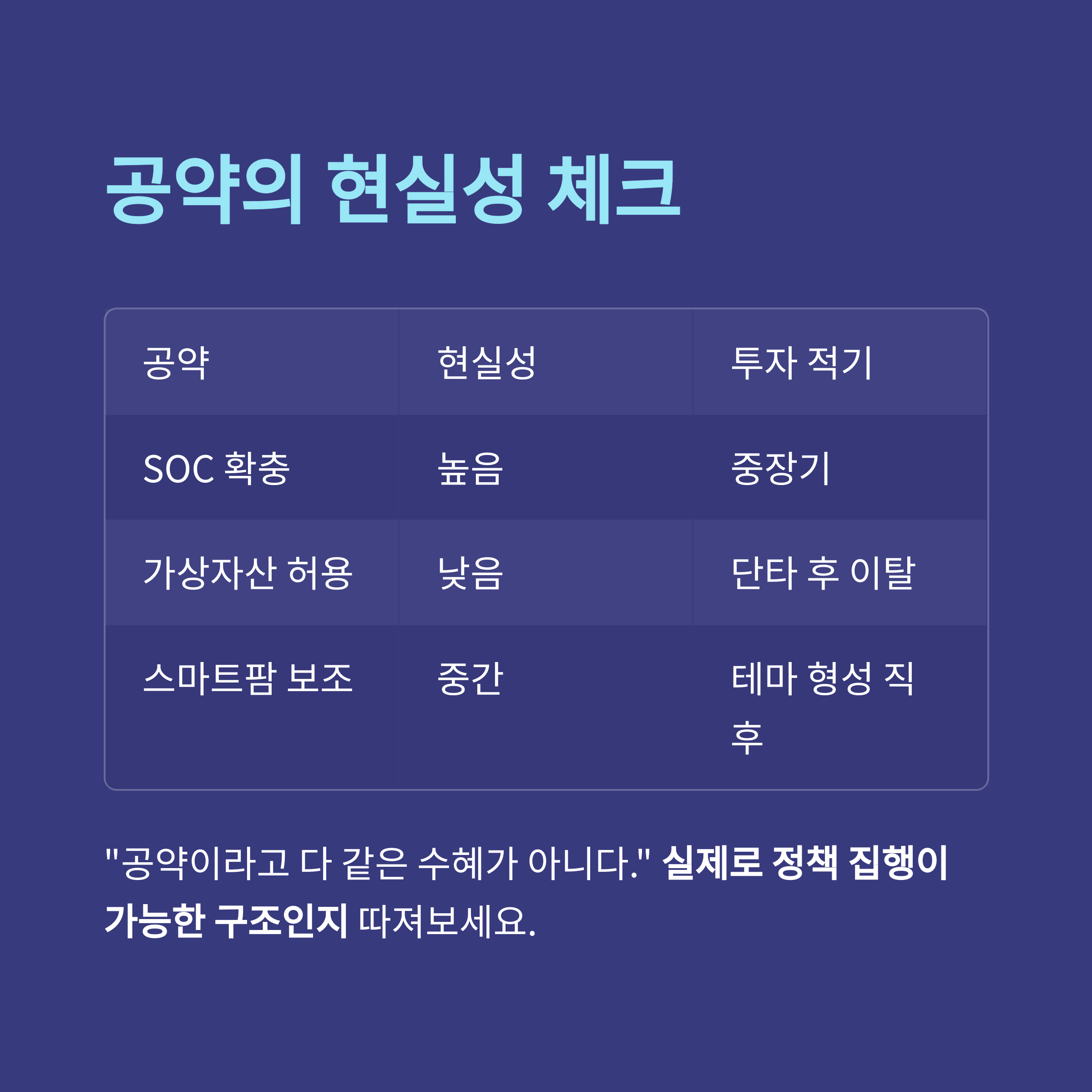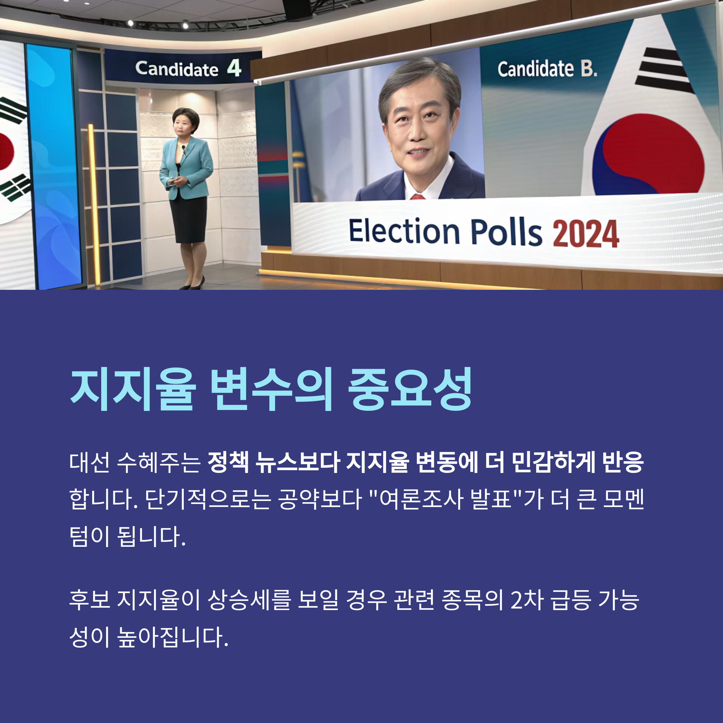 즉, 단기적으로는 공약보다도 "여론조사 발표"가 더 큰 모멘텀이 됩니다.