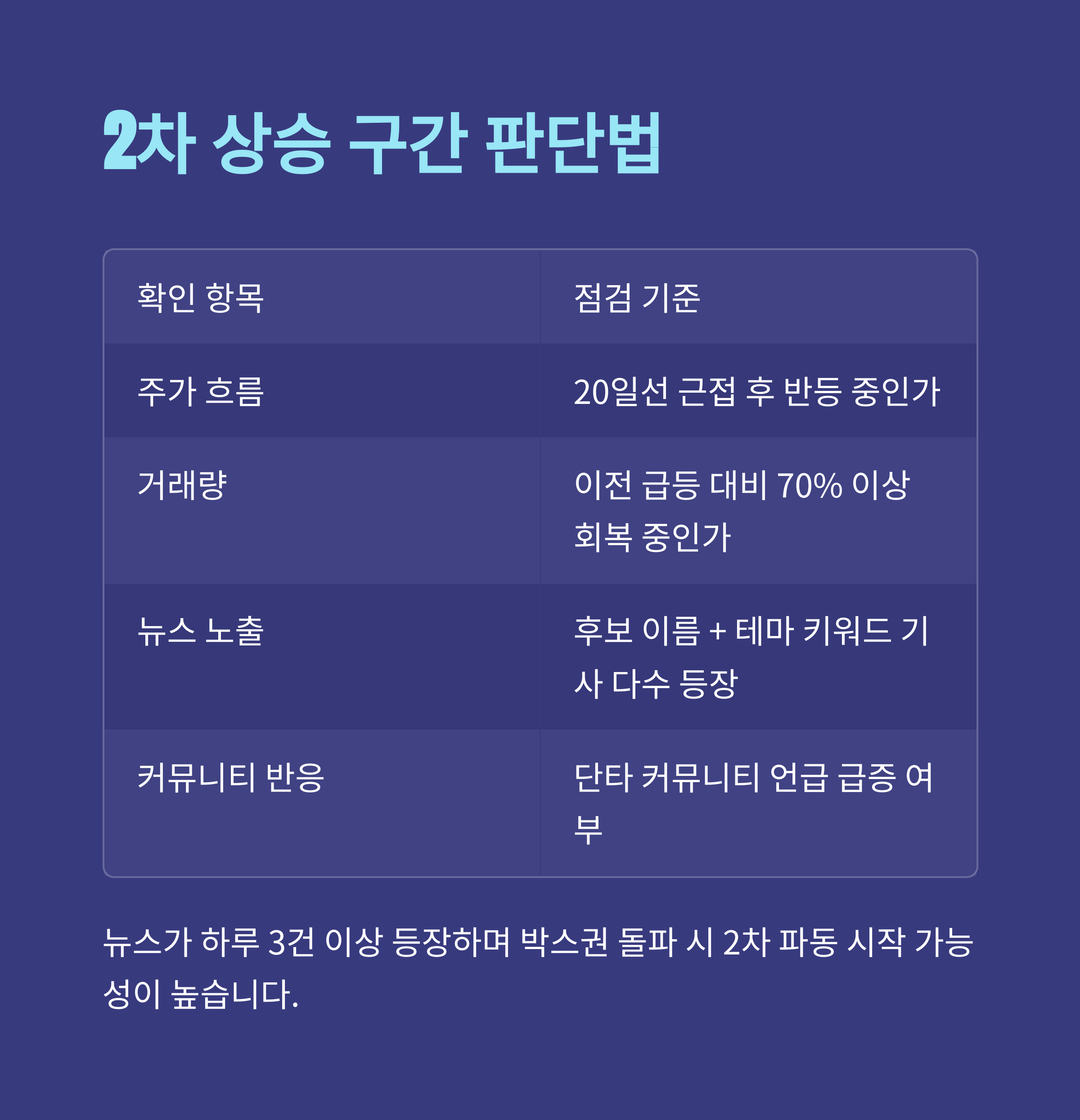 그 후보가 지지율에서 상승세를 보일 경우 2차 급등이 동반될 가능성이 높습니다.