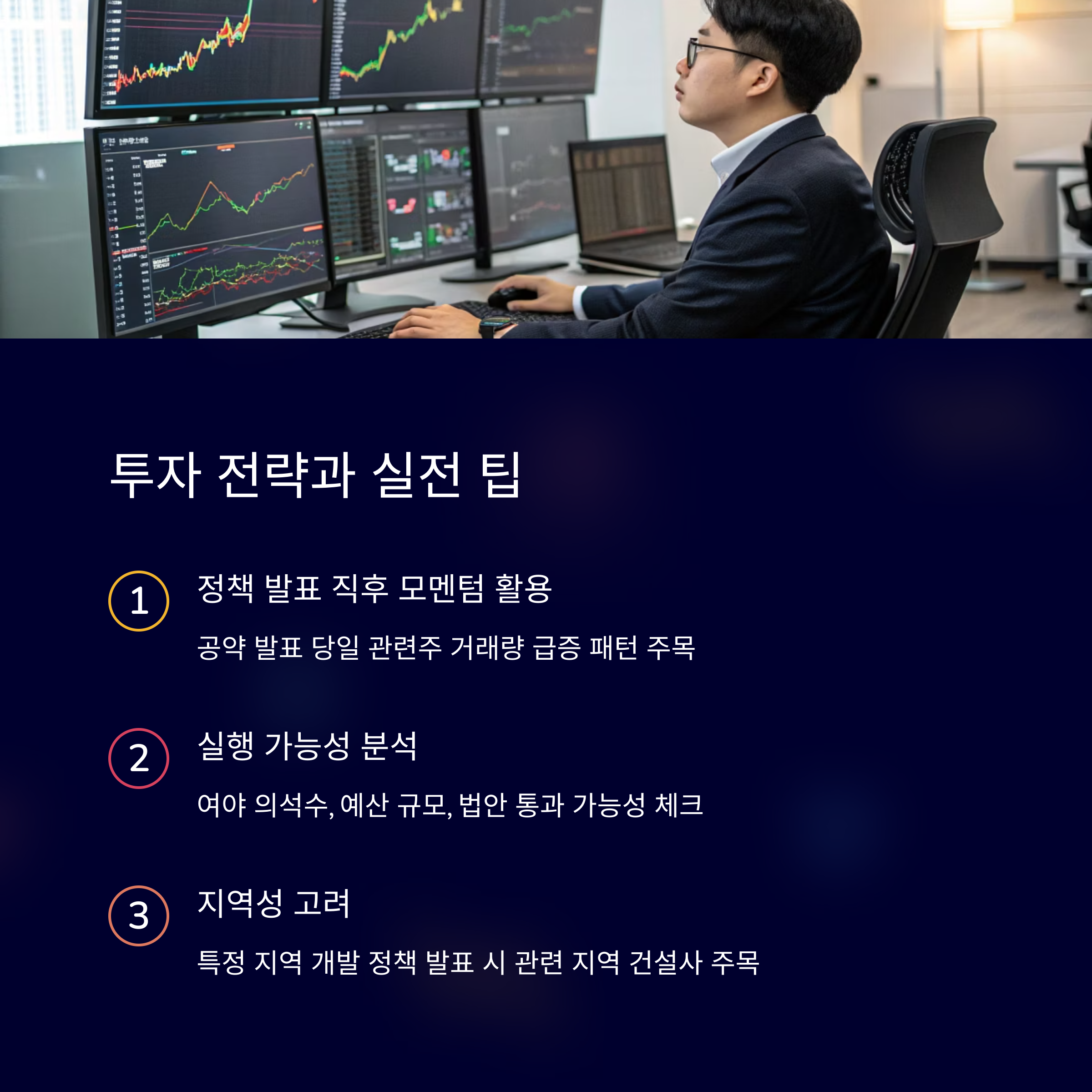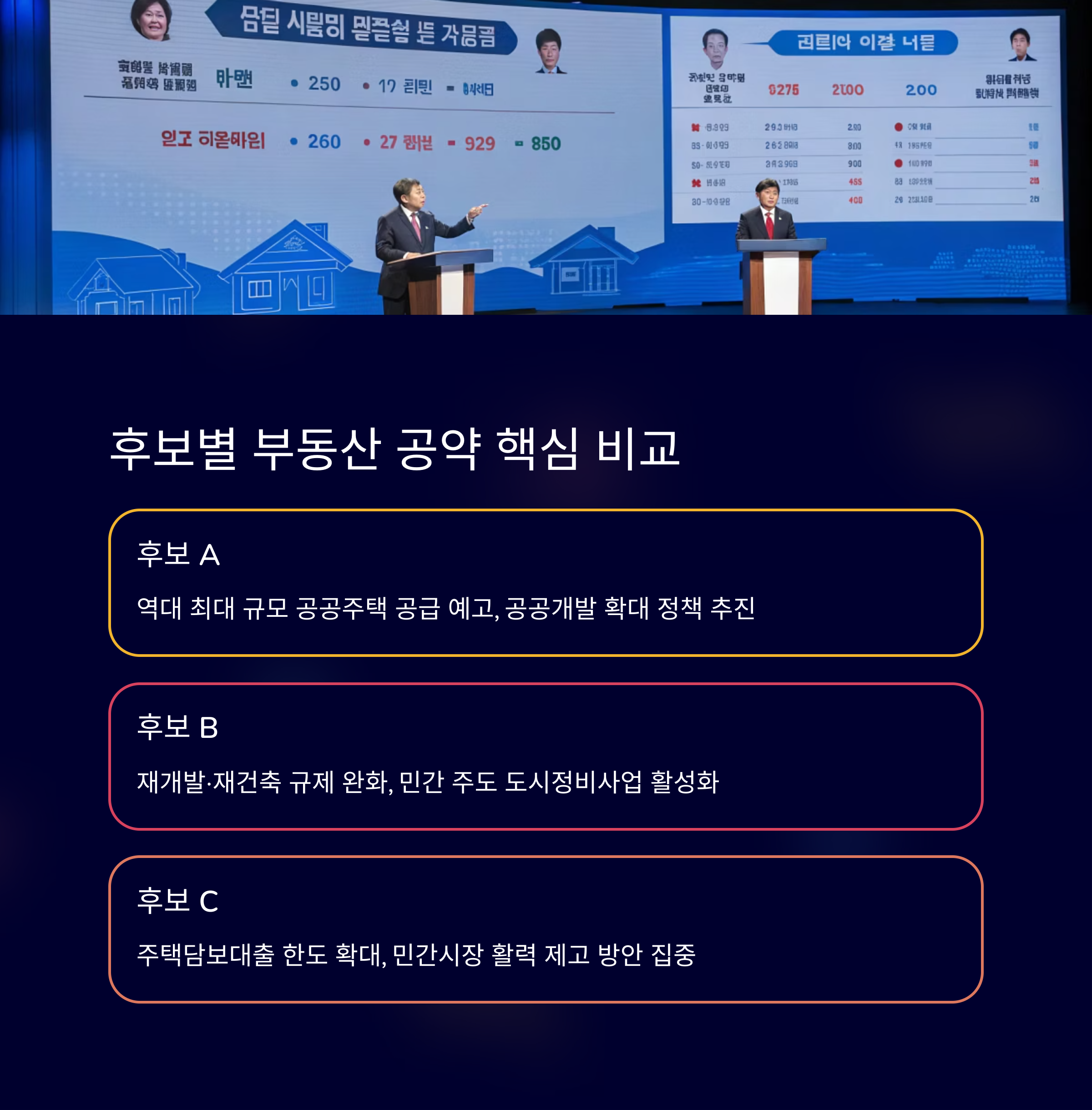 후보별 공약의 디테일을 비교하고, 구체적인 정책 실행 가능성과 지역성을 분석하는 것이 중요합니다. 공약 발표만으로 단기적인 주가 변동이 나타날 수 있으며, 특히 수도권 개발, 공공임대 확대 등의 정책은 건설·정비·자재 업체들에게 직접적인 수혜로 이어질 수 있습니다. 철저한 분석과 예측을 통해 현명한 투자로 연결해보시기 바랍니다.
