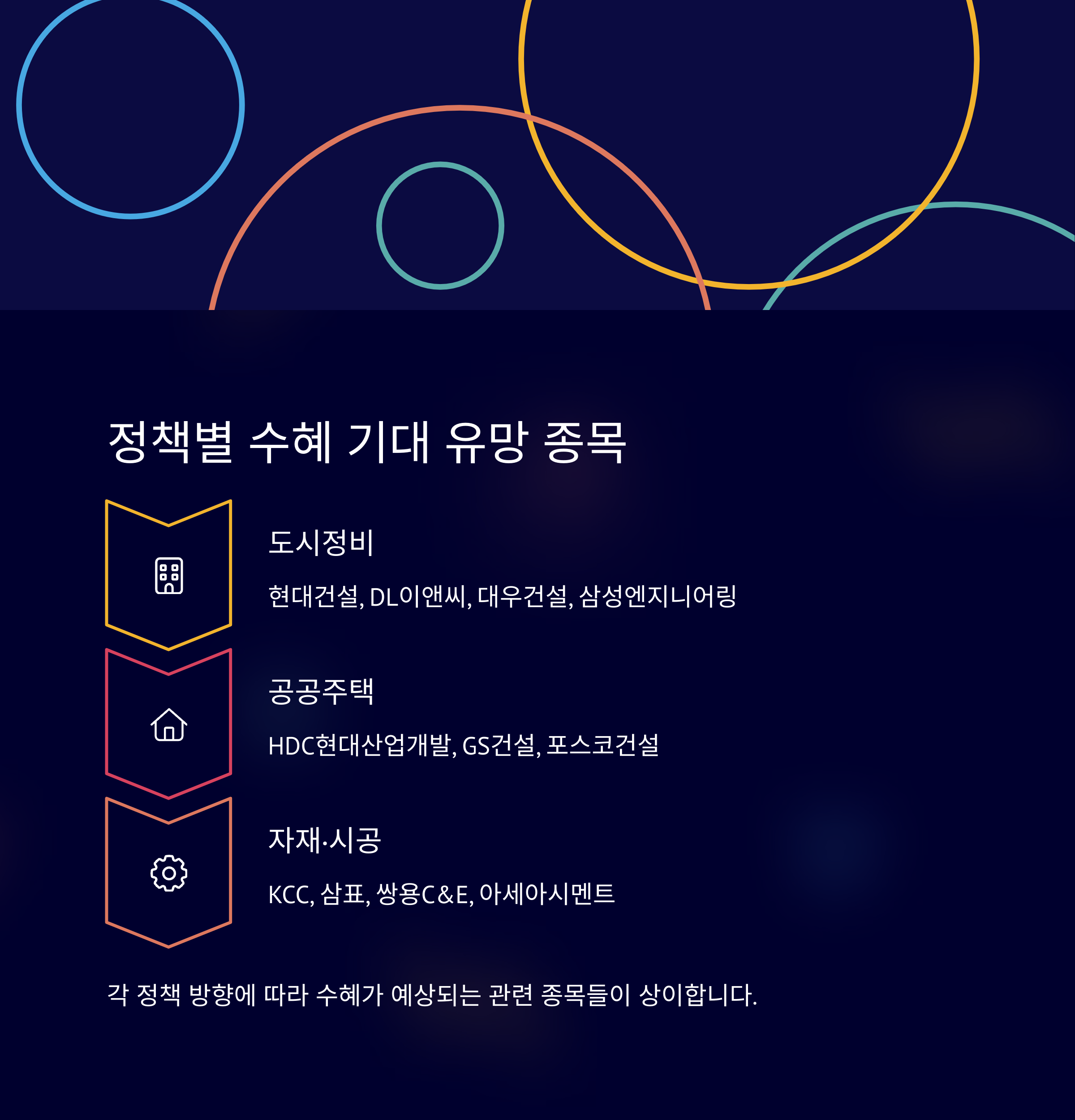 | 부동산 수혜주 | 도시정비, 건설, 인테리어 업종 주목받는 중 |