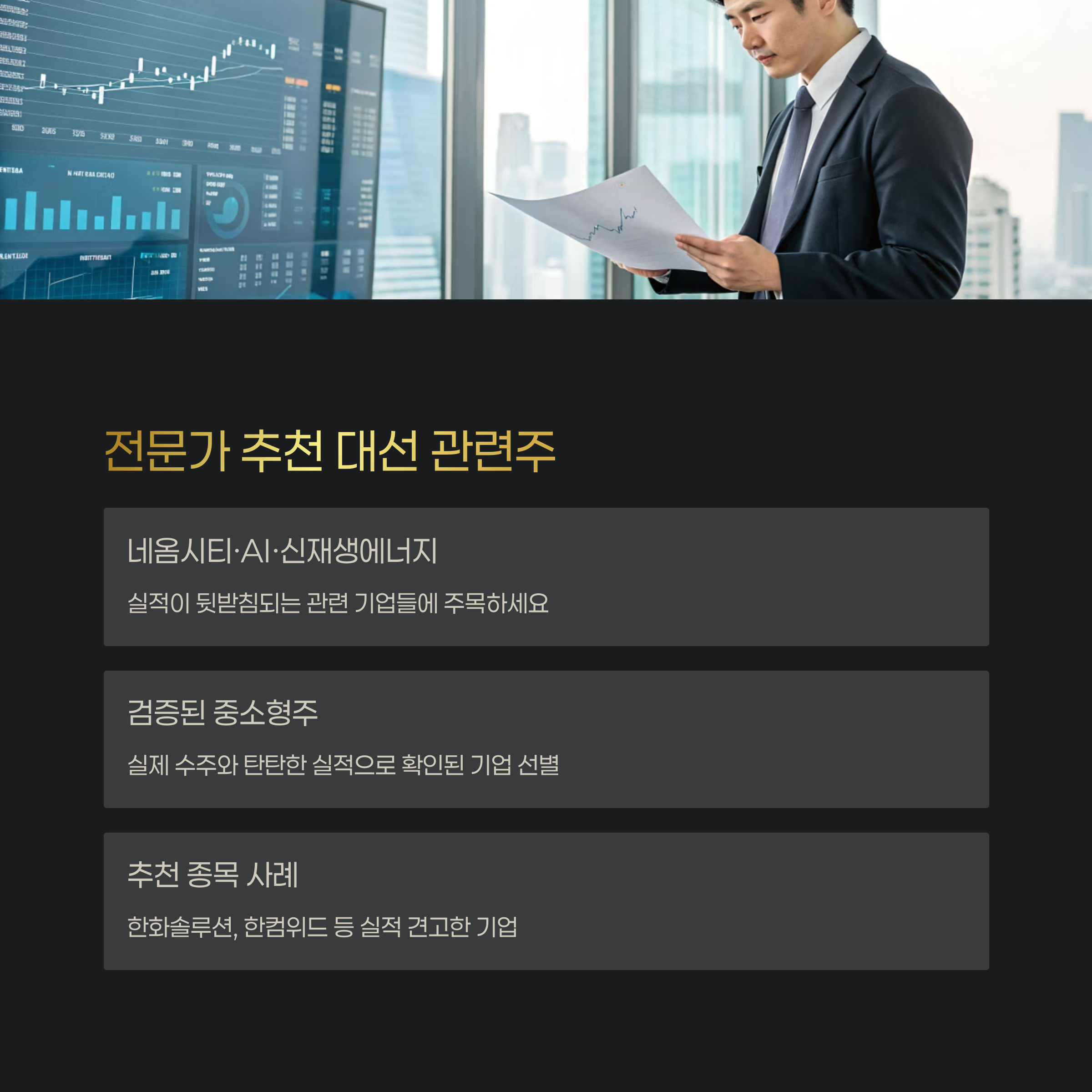 - 정책 수혜주 중심의 투자: 정치인의 공약과 관련된 산업의 기업에 투자합니다.