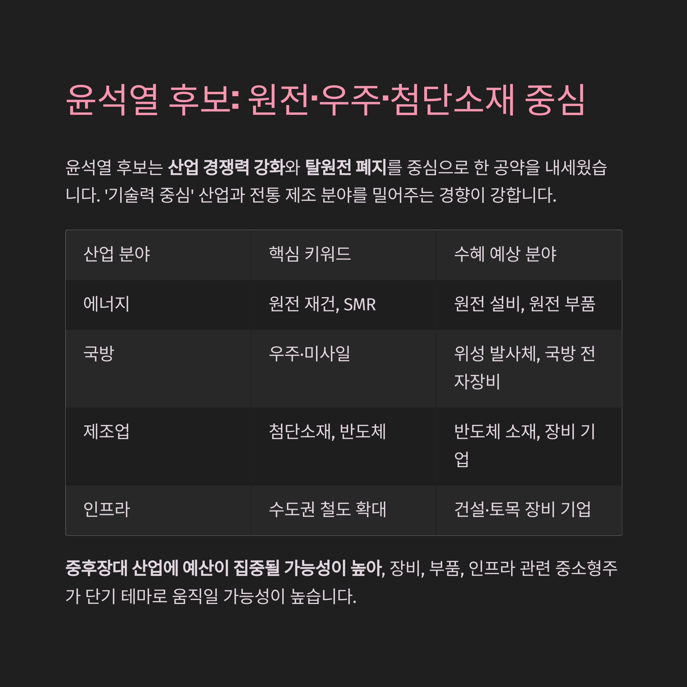 | 윤석열 | 전통 제조+국방 | 원전, 반도체, 우주 | 중장기, 실물 중심 |