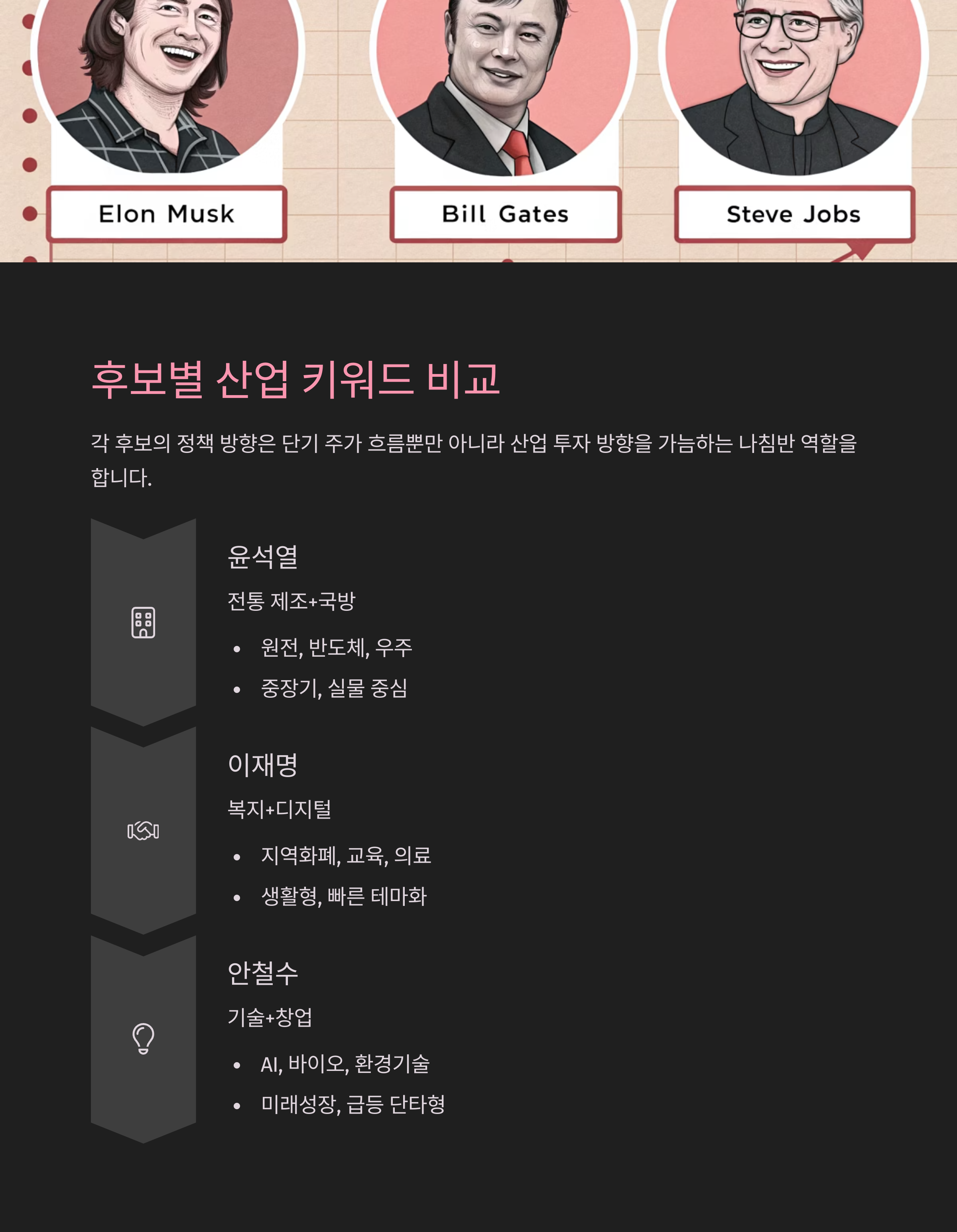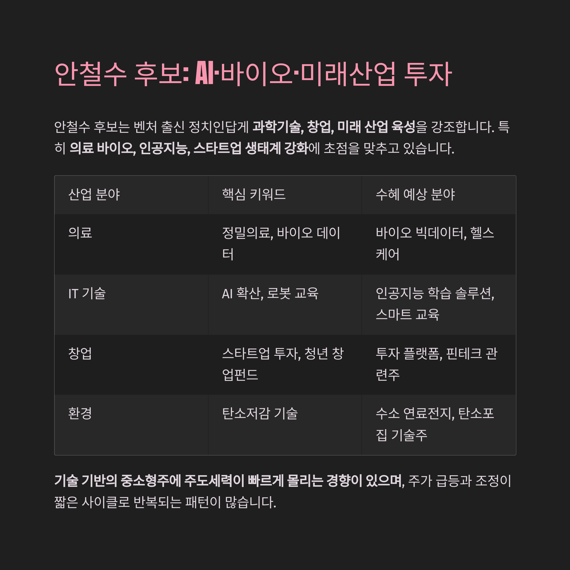 | 안철수 | 기술+창업 | AI, 바이오, 환경기술 | 미래성장, 급등 단타형 |