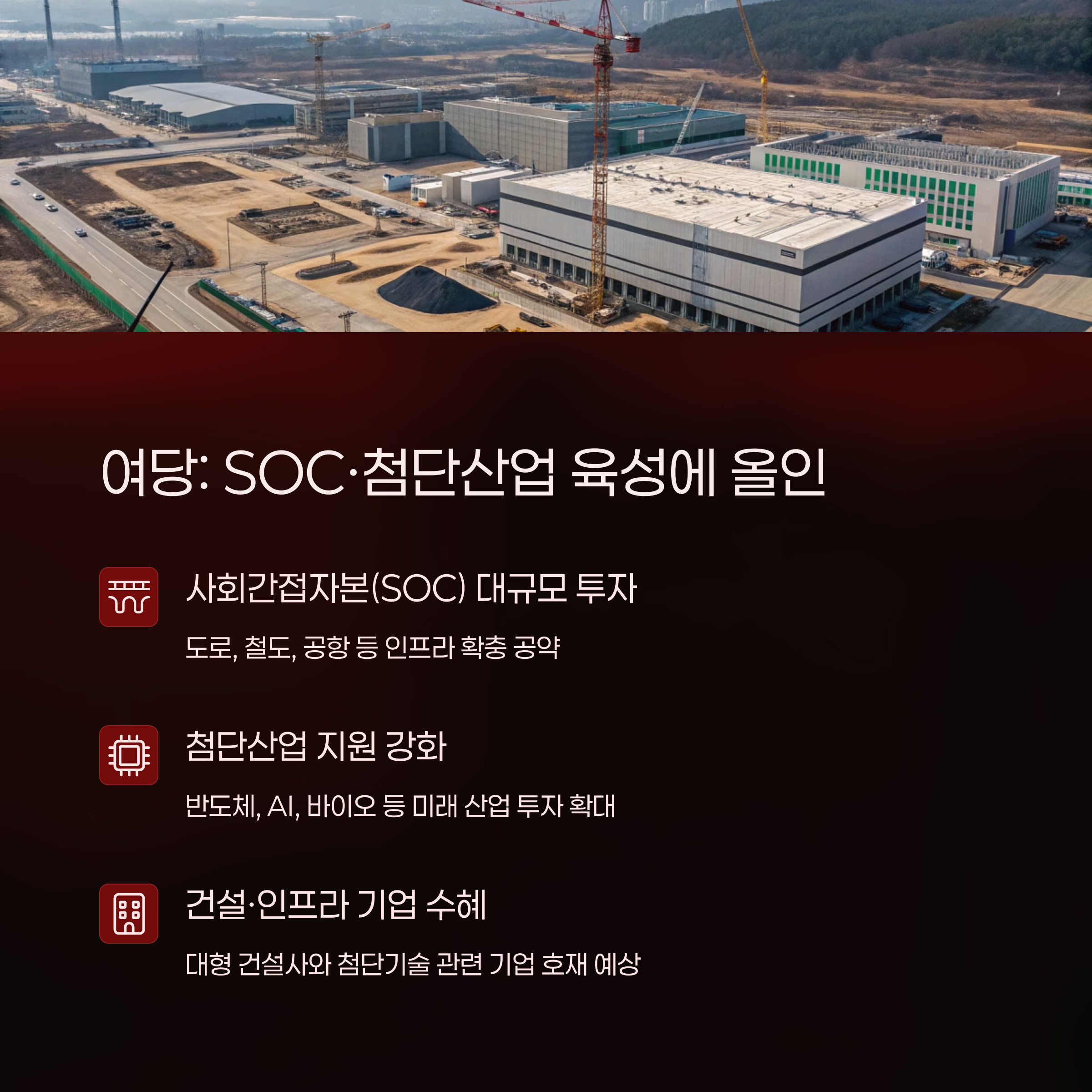 여당은 경제 성장을 주도하기 위해 첨단 산업 육성과 대규모 SOC 투자를 공약의 핵심으로 내세우고 있습니다. 반도체, 배터리, 수소경제 등 차세대 산업에 대한 지원이 구체화되며, 이에 따라 해당 산업군의 기업들이 수혜를 입을 가능성이 높습니다. 특히 건설 및 인프라 업종은 국가 프로젝트 및 공공 인프라 확대 정책으로 인해 직접적인 수혜를 기대할 수 있으며, 이는 건설기계, 시멘트, 철강 등의 관련 종목에도 긍정적인 영향을 줄 수 있습니다. 정책 발표 이후 관련 종목들의 주가 흐름을 살펴보면, 시장의 기대감이 선반영되고 있는 모습도 확인됩니다.