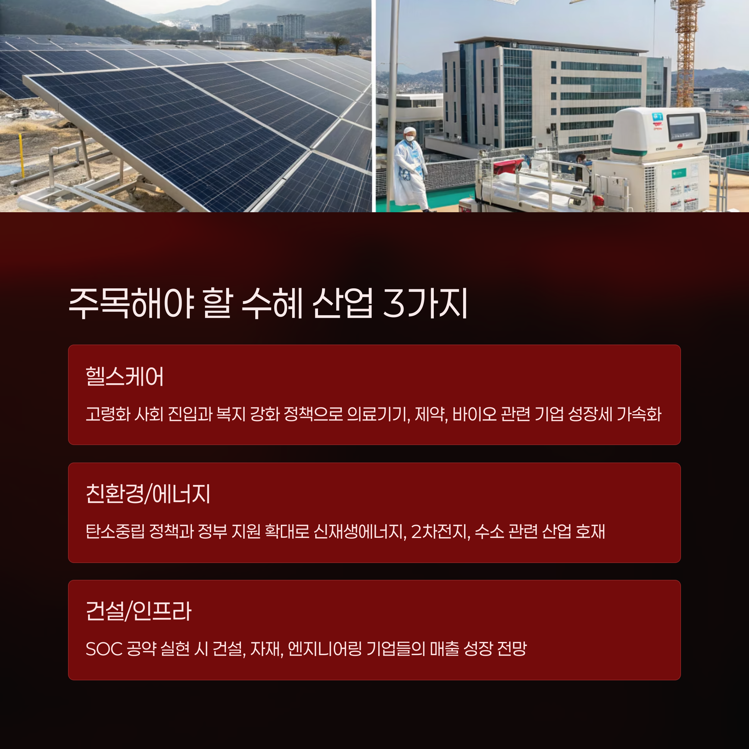 | 수혜 가능 산업 | 헬스케어, 친환경, 건설, 교육 관련 업종 |