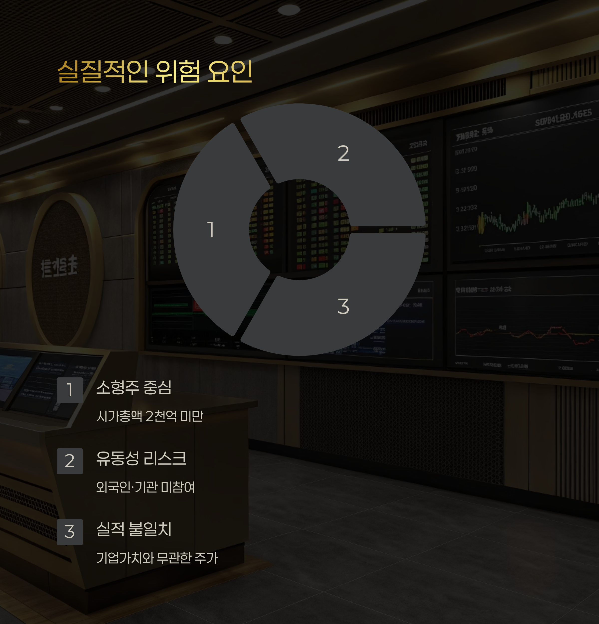 - 수급 왜곡: 세력 중심의 움직임이 가격을 좌우합니다.
