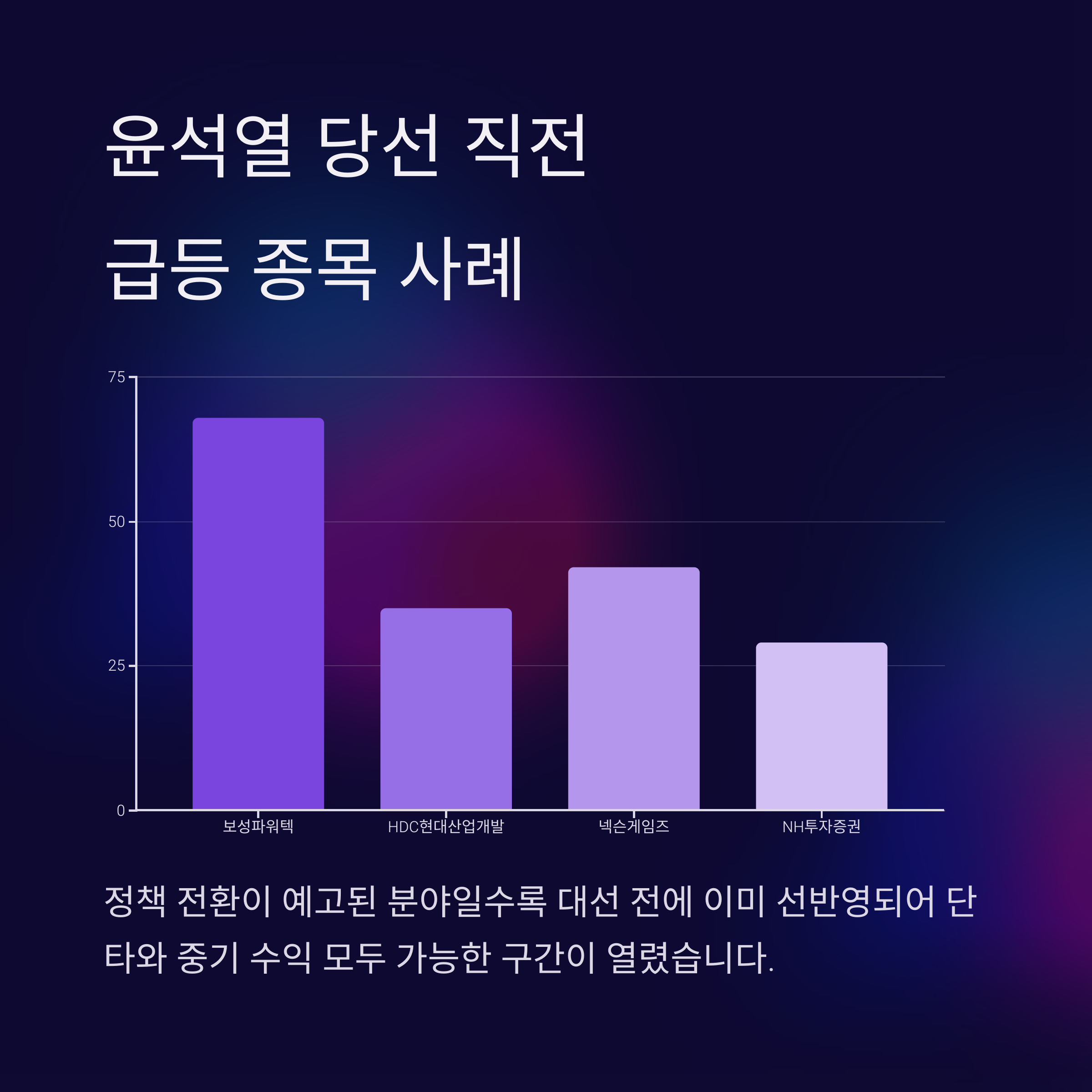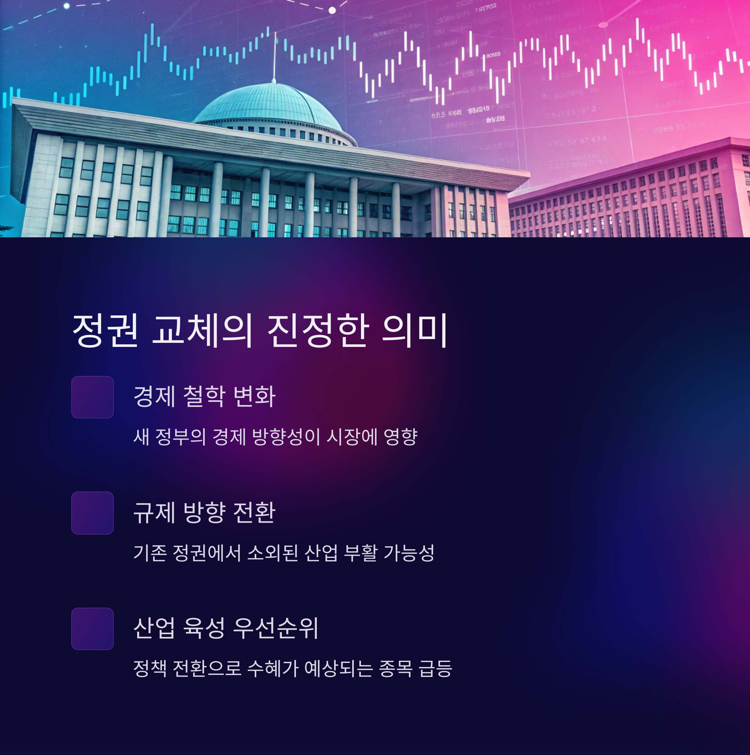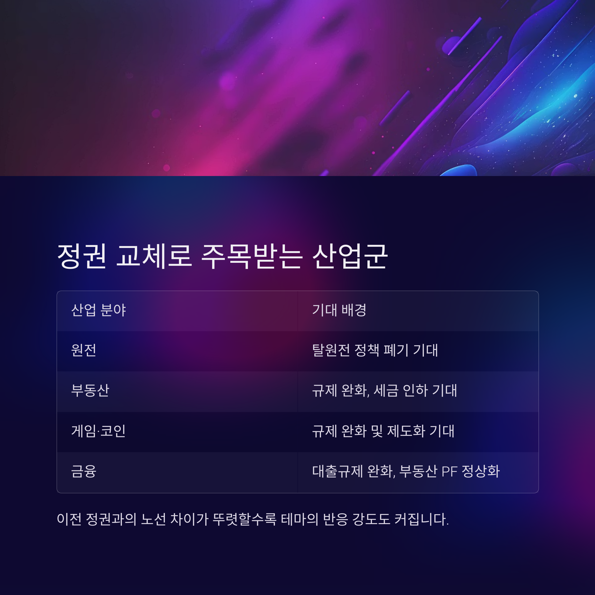 특히 ‘이전 정권에서 제한되었거나, 규제받았던 산업군’이 정권 교체 기대감의 핵심 수혜 대상입니다.