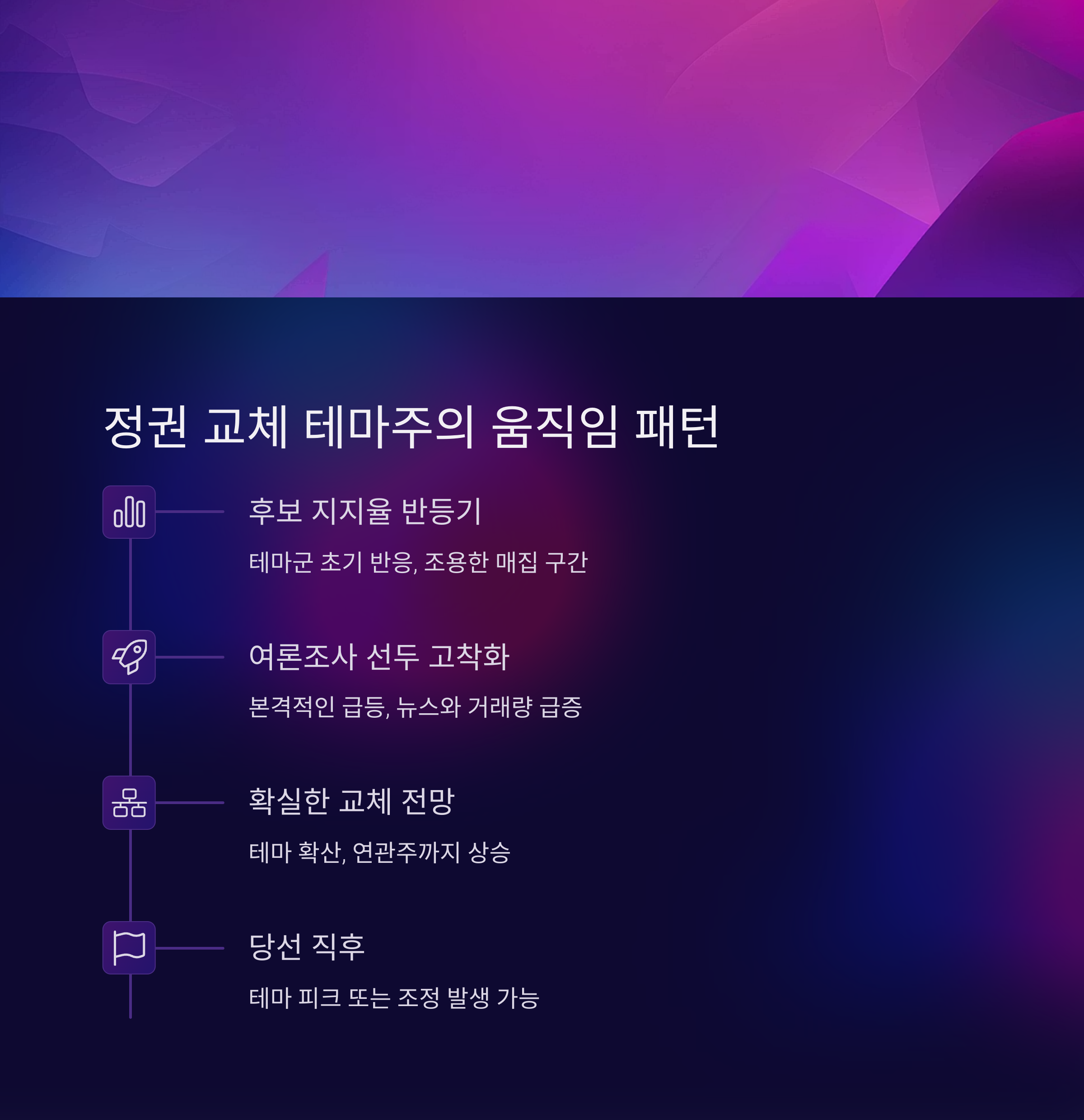 정권 교체 기대 테마는 보통 아래 흐름으로 진행됩니다.