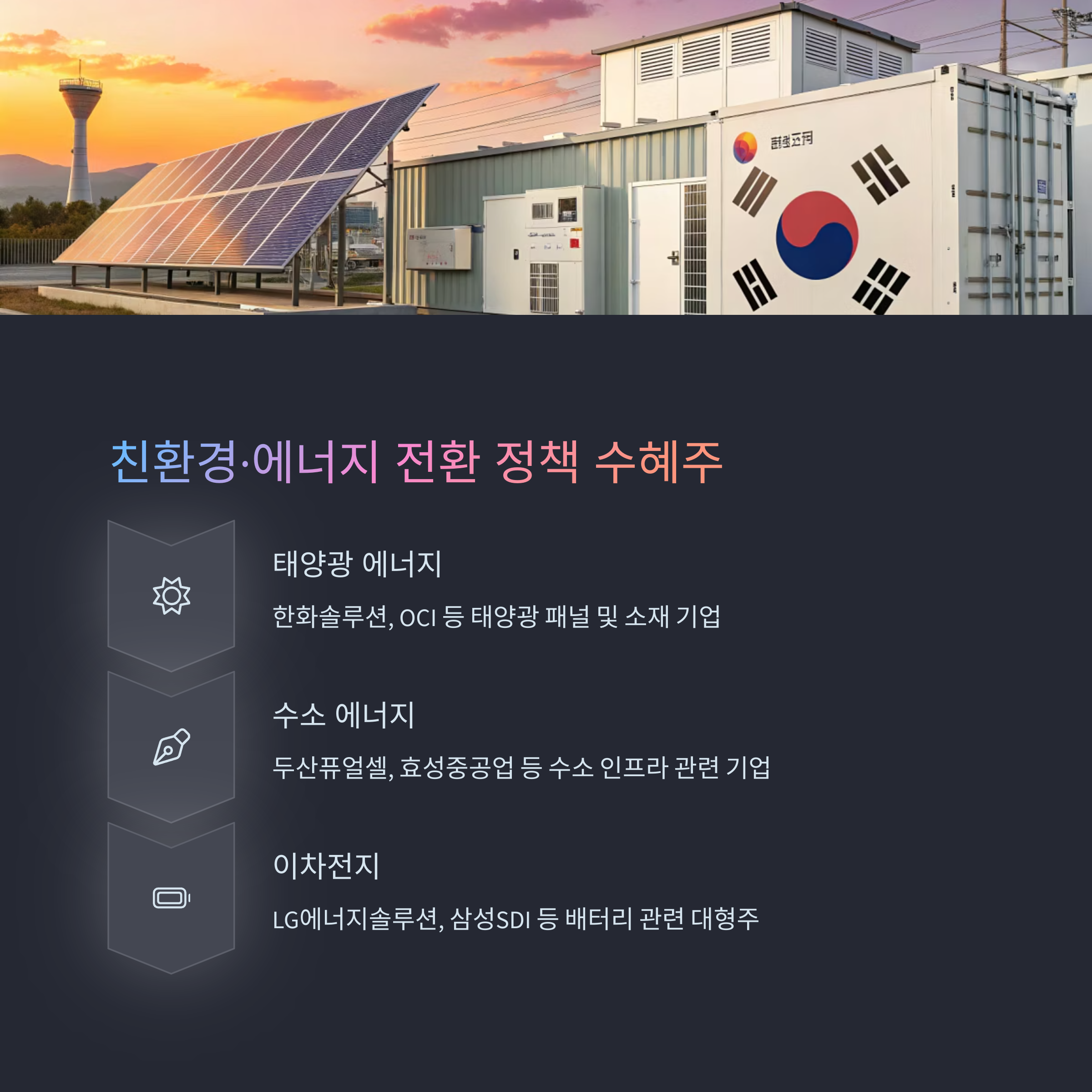 - 탄소중립 정책 → 친환경, 수소, 재생에너지 기업