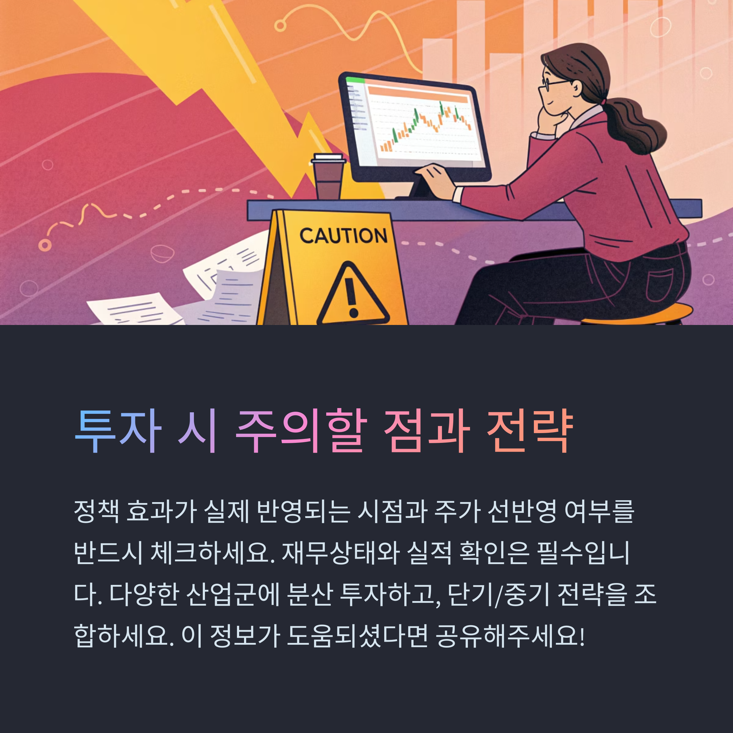 - 종목 실적 확인: 정책 수혜 기대주라 해도 실적 부진하면 장기 보유 위험