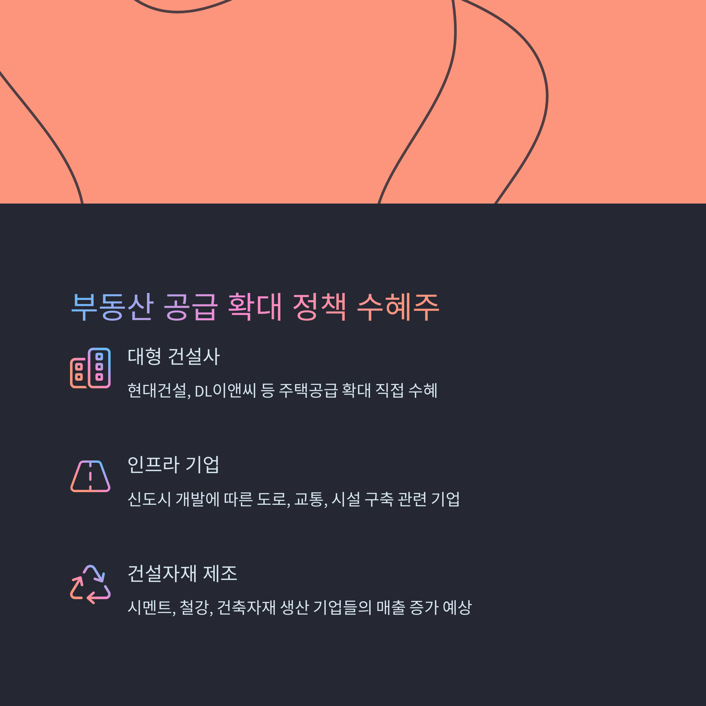 - 부동산 공급 확대 → 건설, 인프라 관련주