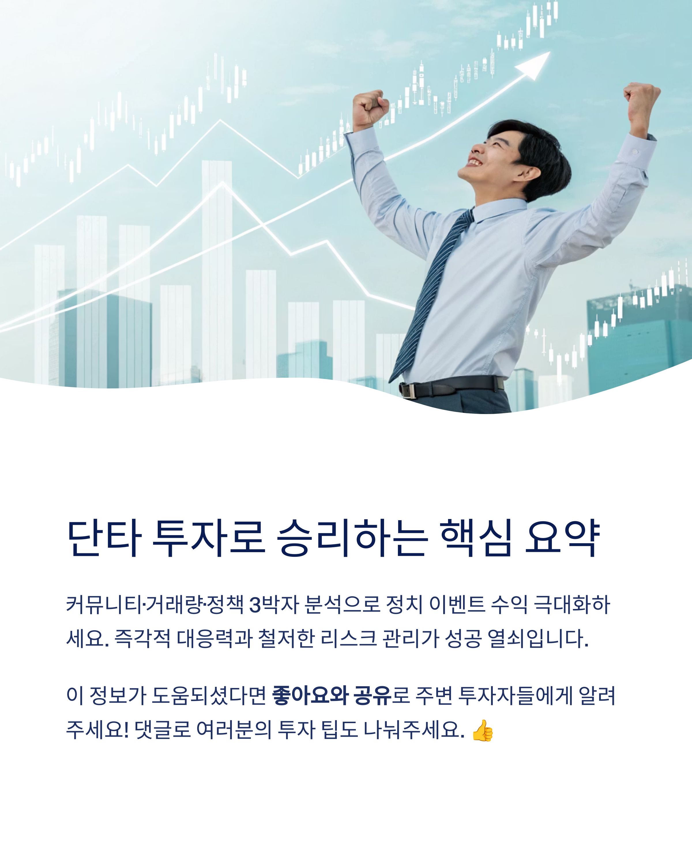 - 정치 이벤트 직후 첫 거래일 → 차익실현 물량 폭탄 주의