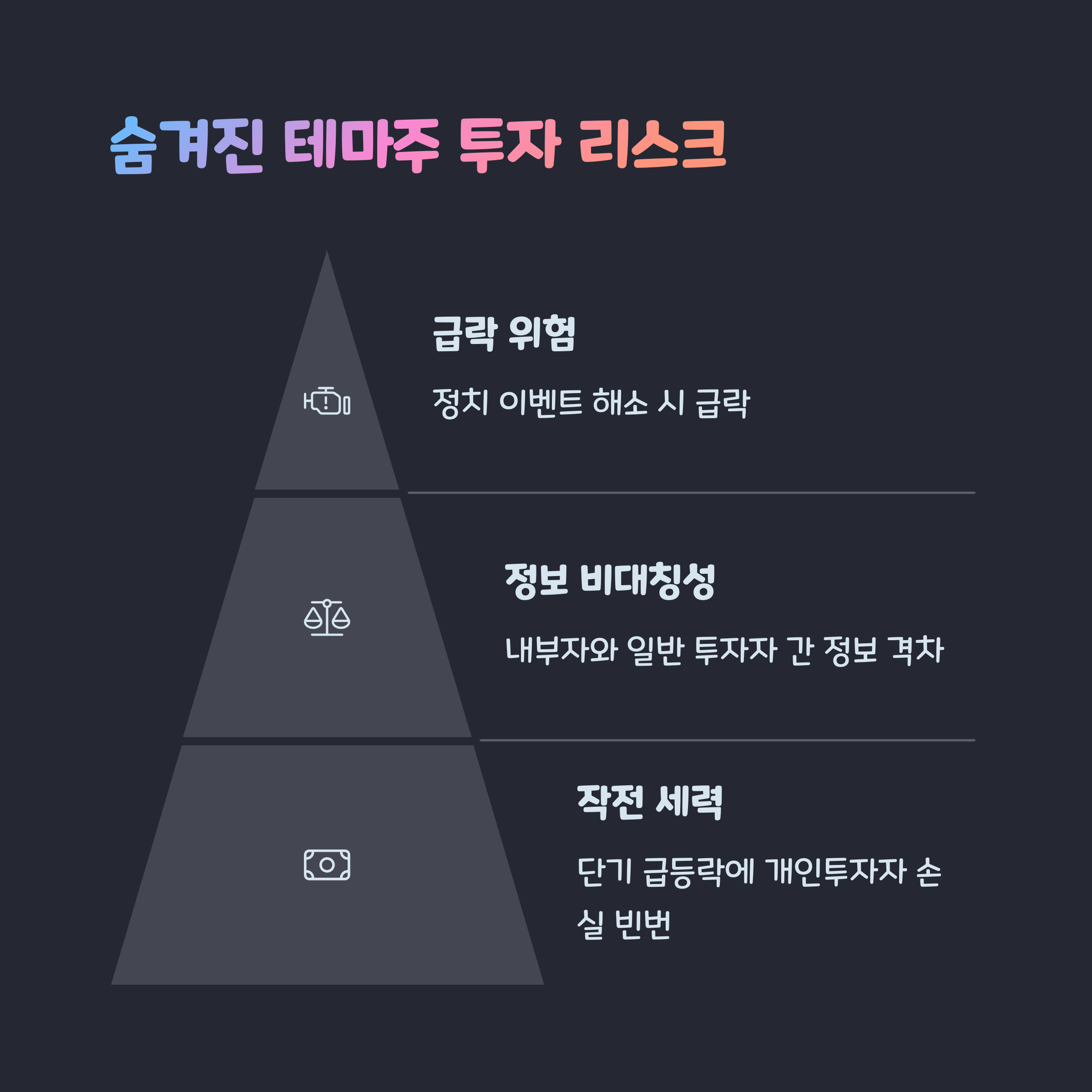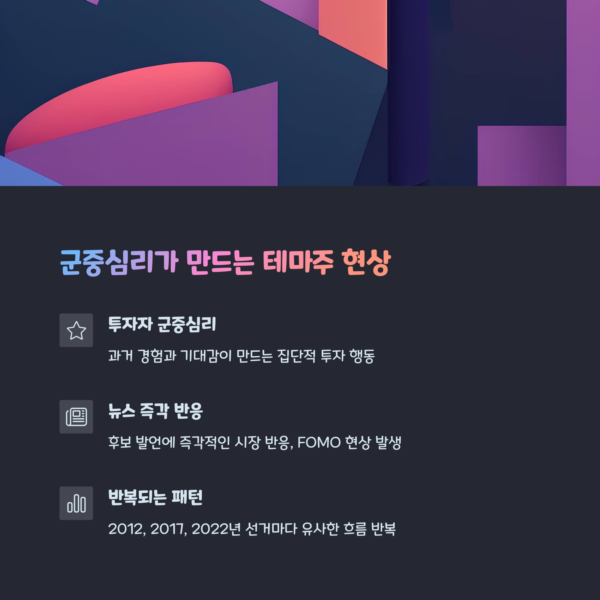 | 실적과 무관한 단기 흐름 반복 | 선거 때마다 같은 패턴 재현 | 테마 종료 시점 예측 중요 |