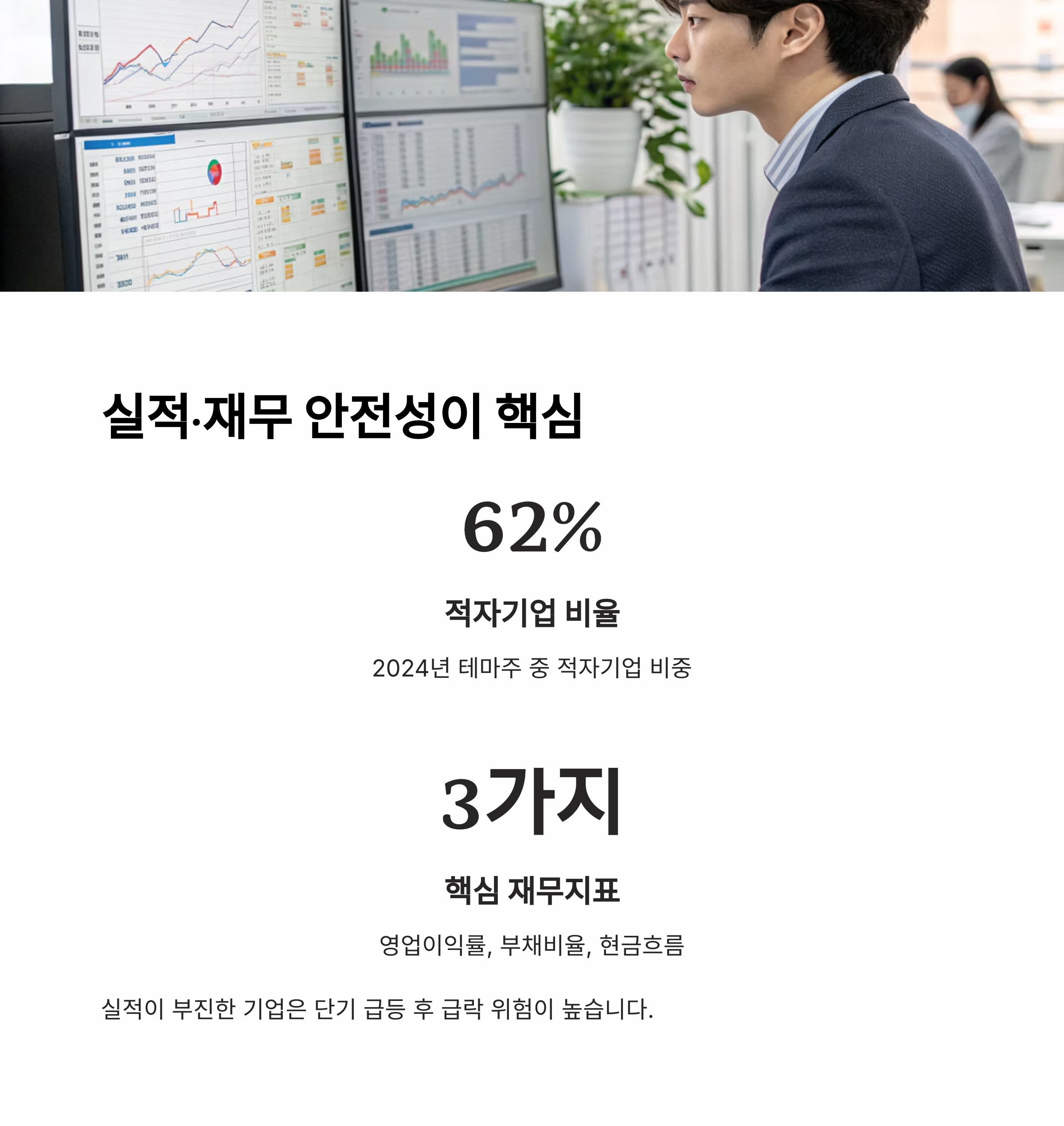 | 실적 확인과 수혜 가능성 체크 | 고점 대비 눌림목 진입 전략 | 손실 제한, 수익 실현 구간 분할 설정 |
