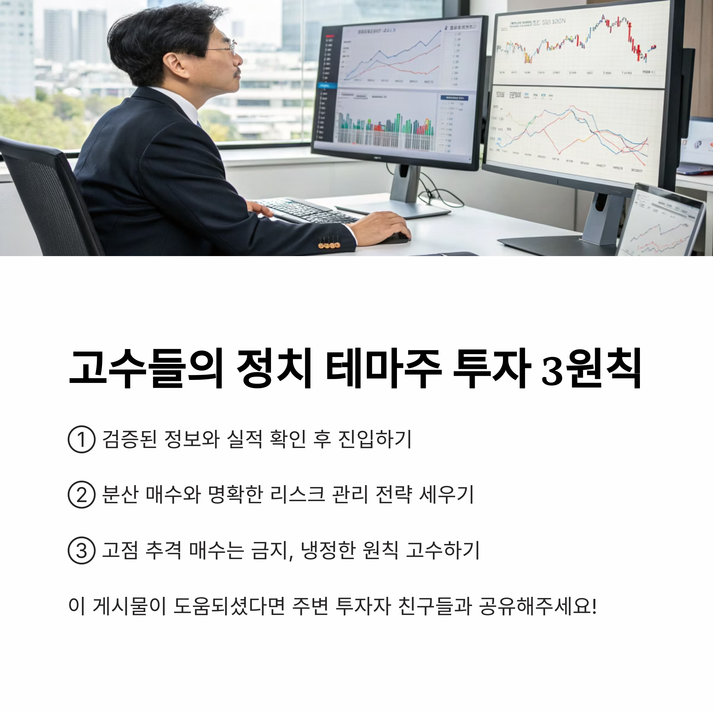 | 정치 테마와 기업의 연관성 검토 | 거래량 증가, 이동평균 돌파 분석 | 분할 매수 및 손절 기준 설정 |