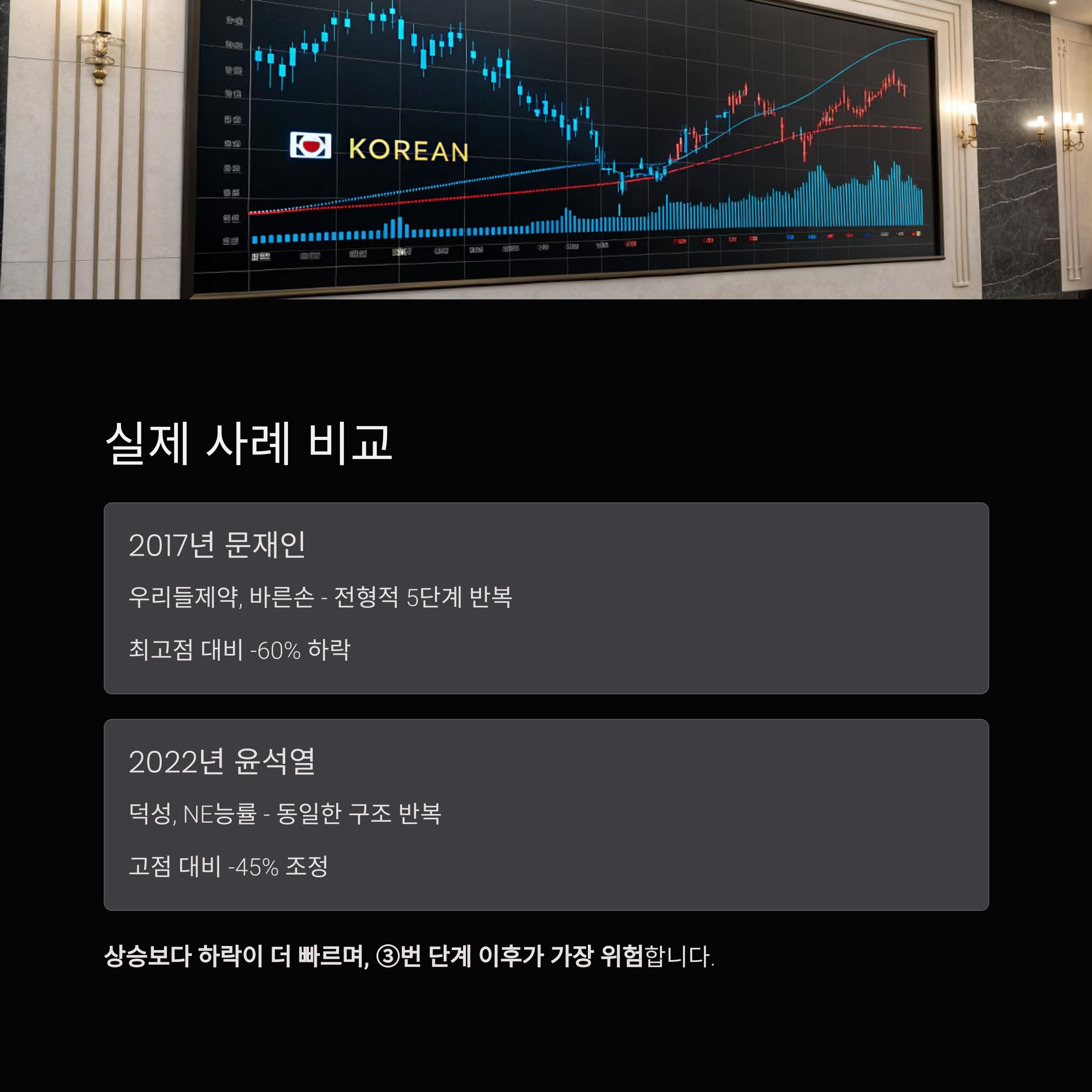 | 2022 | 윤석열 | 덕성, NE능률 | 동일한 구조 반복 | 고점 대비 -45% 조정 |