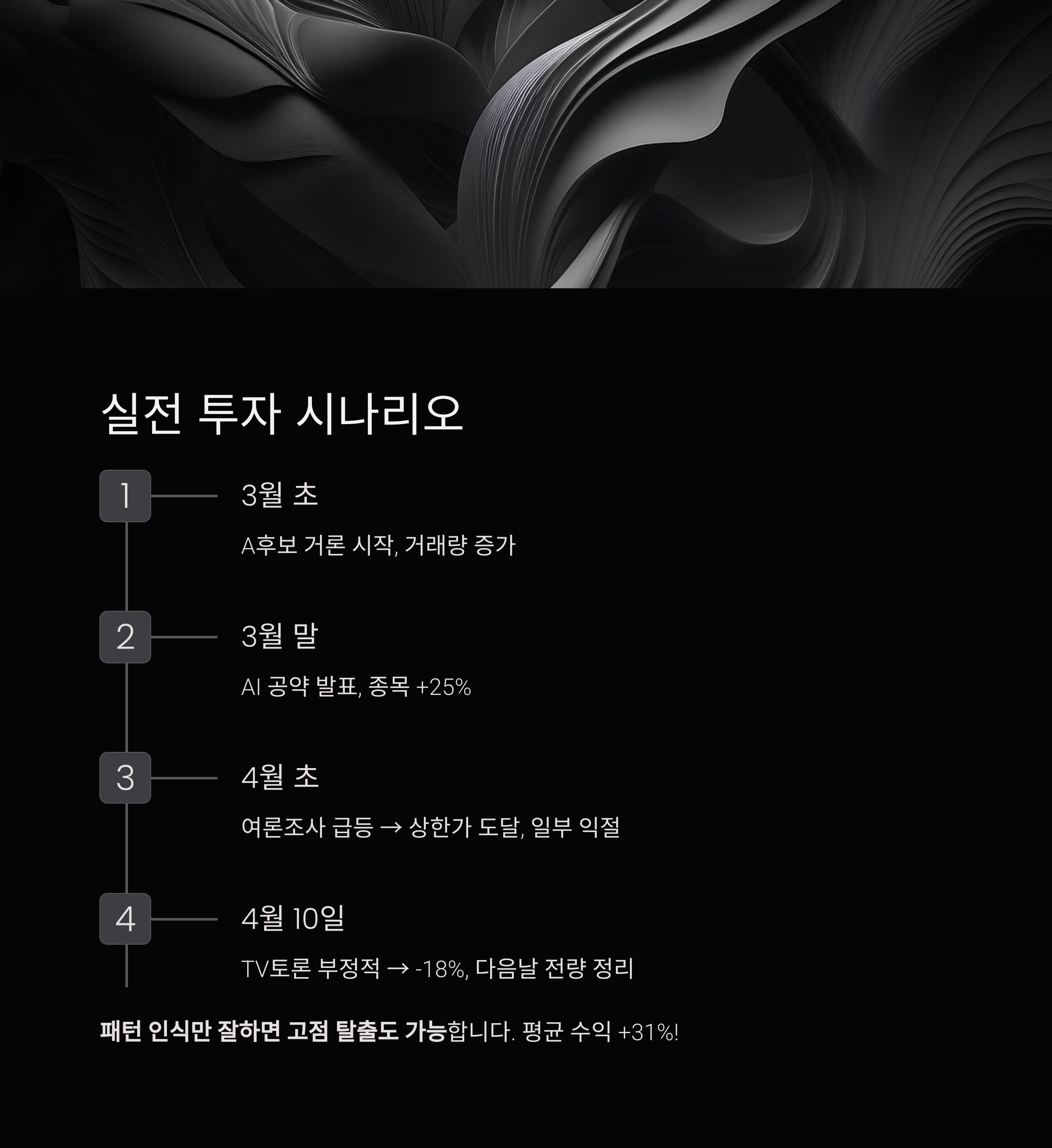 | ③ 여론조사 급등 | 관련 종목 뉴스 릴레이, 연속 상한가 발생 | 보유자는 익절 타이밍 계산, 신규 진입은 지양 |