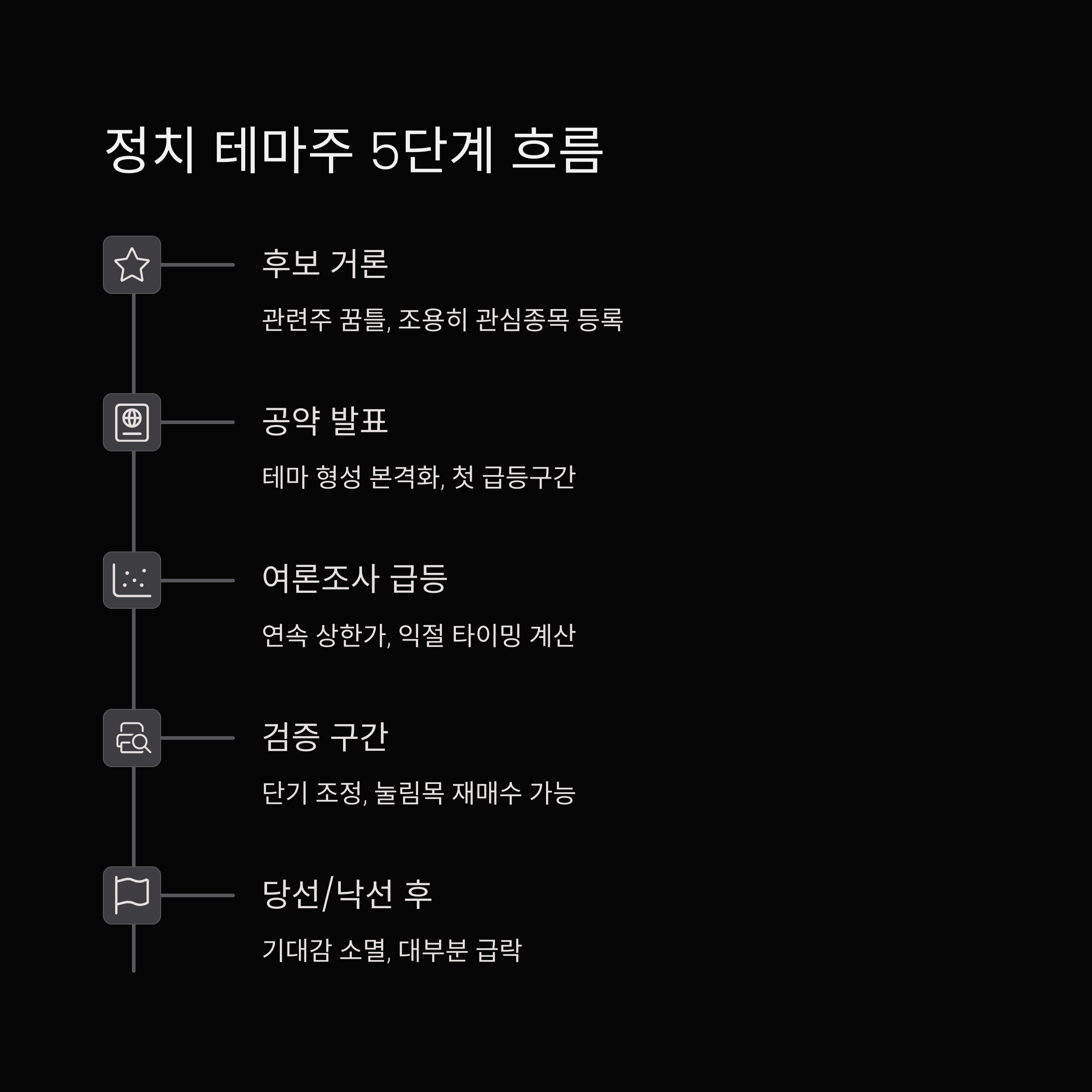[패턴 시나리오 요약표] 정치 테마주 시세 흐름 5단계
