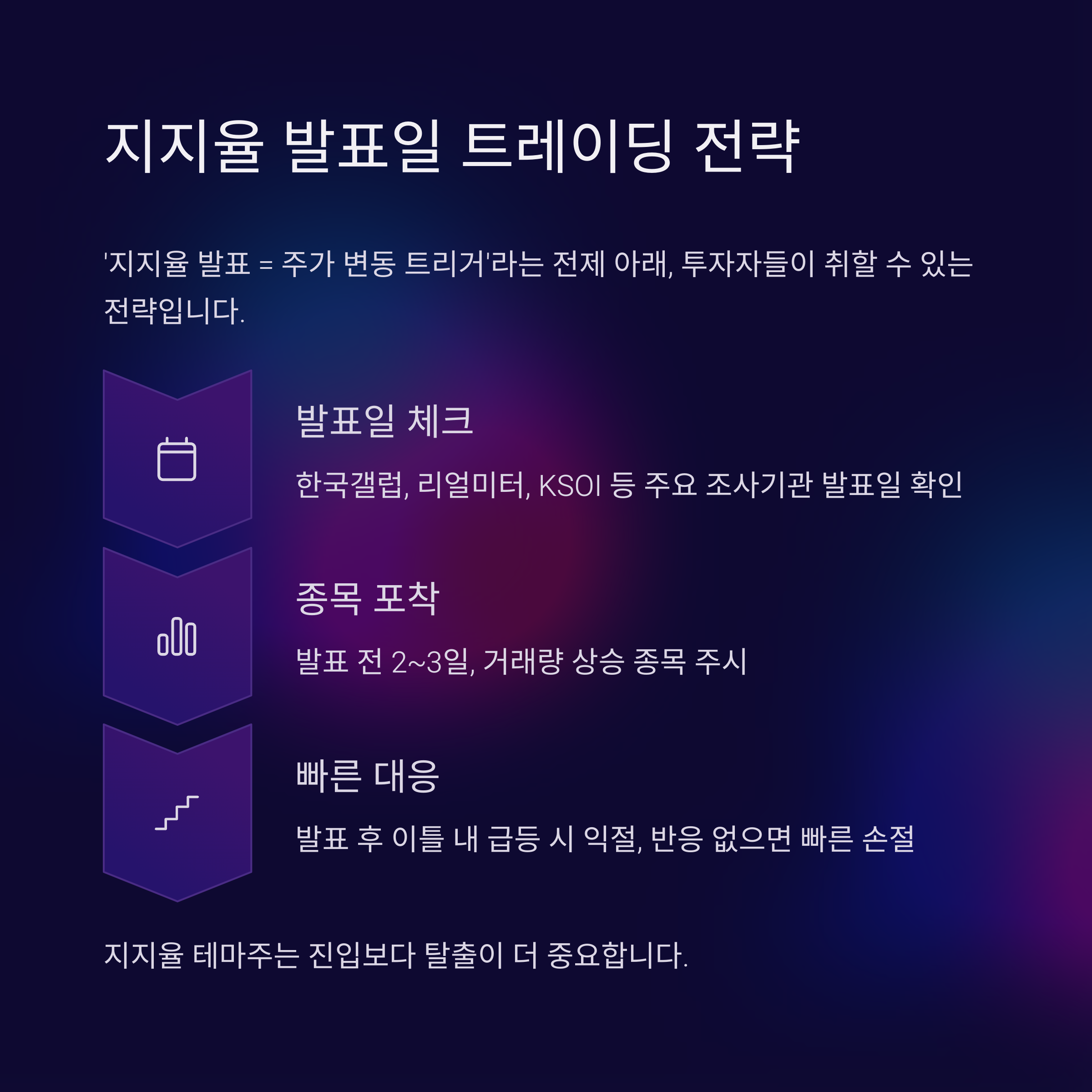 - 발표 후 이틀 내 급등 시 익절,