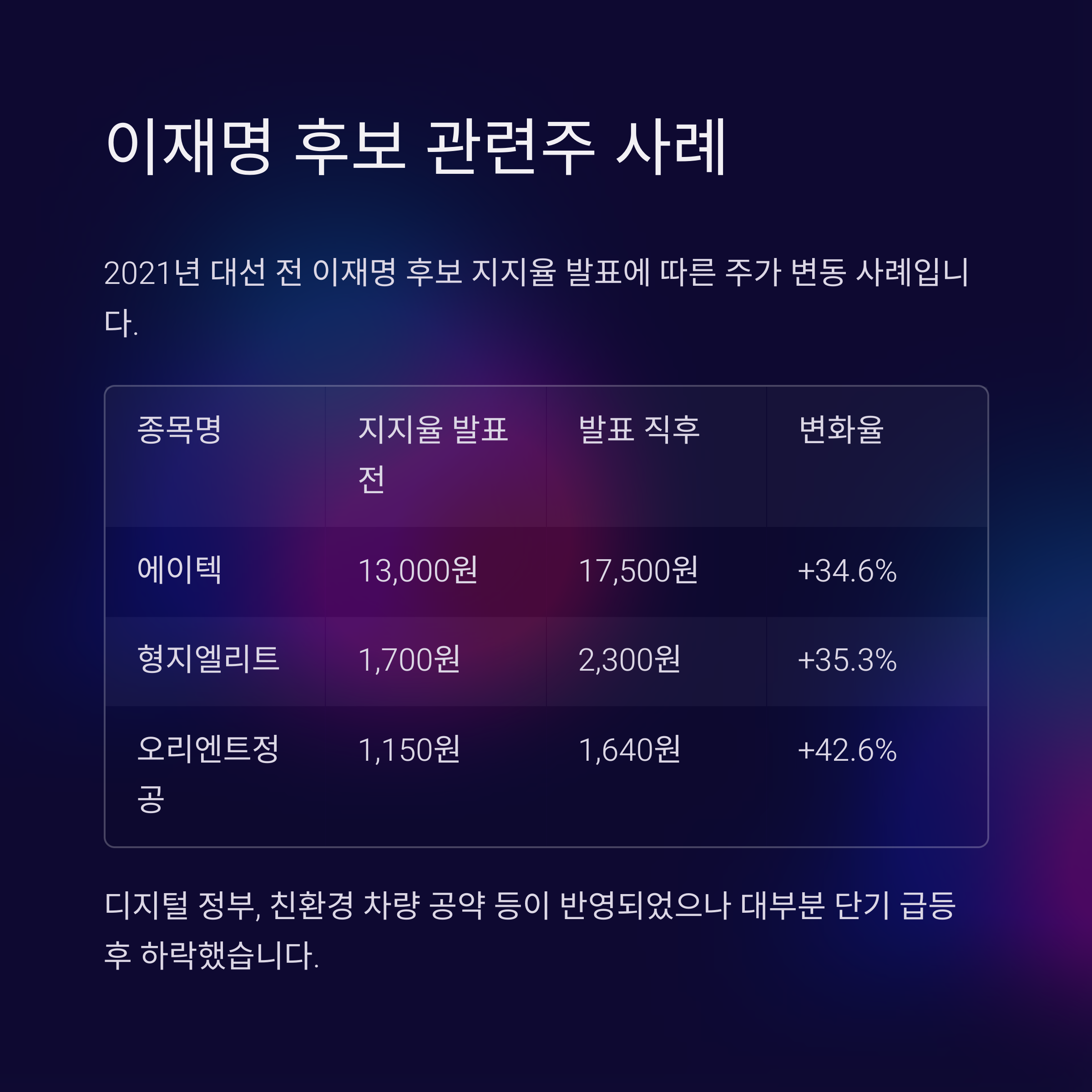 실제 사례 1: 이재명 후보 관련주 (2021년 대선 전)