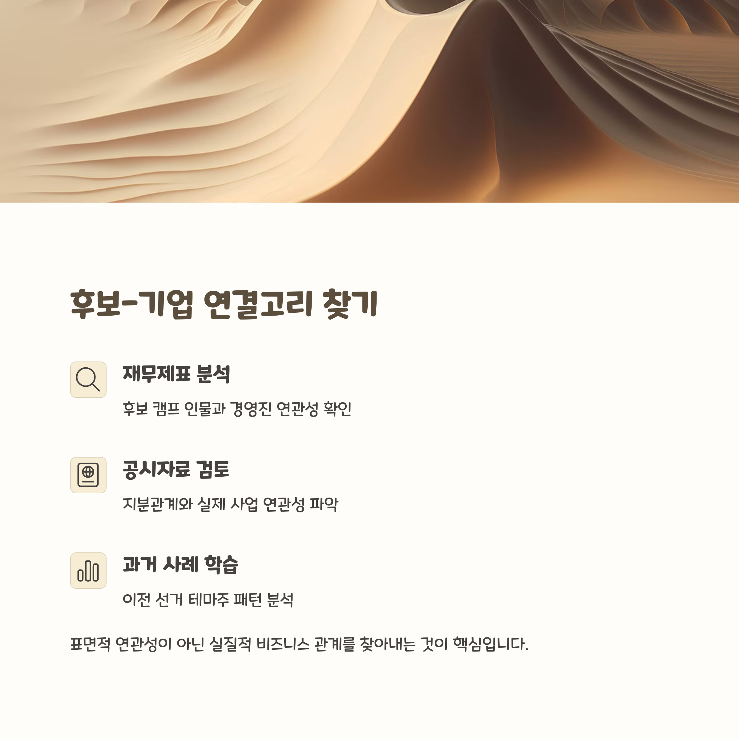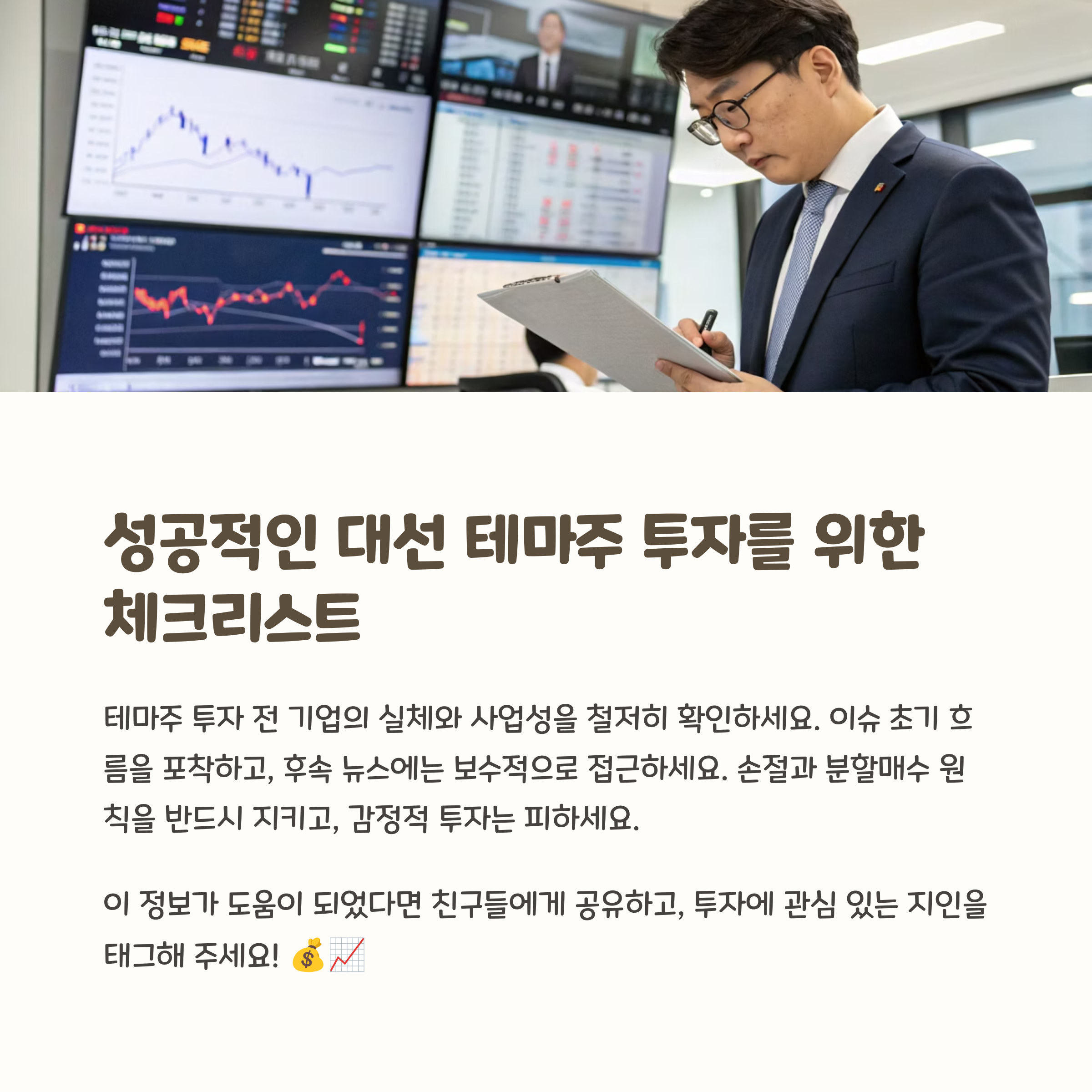 | 후보 배경과 연관된 기업 중심 | 거래량 증가 구간 또는 눌림목 | 손절 기준 명확하게 설정 |