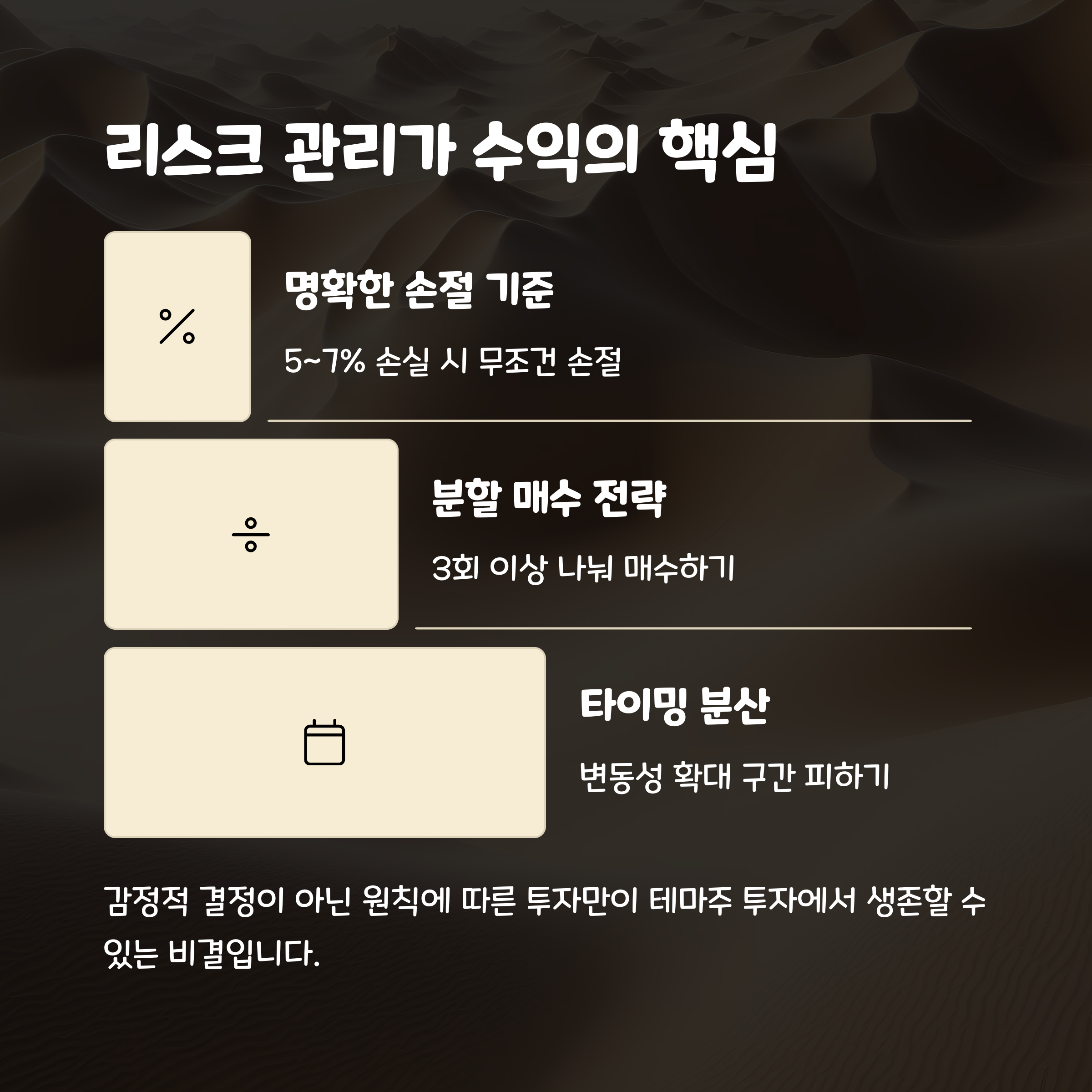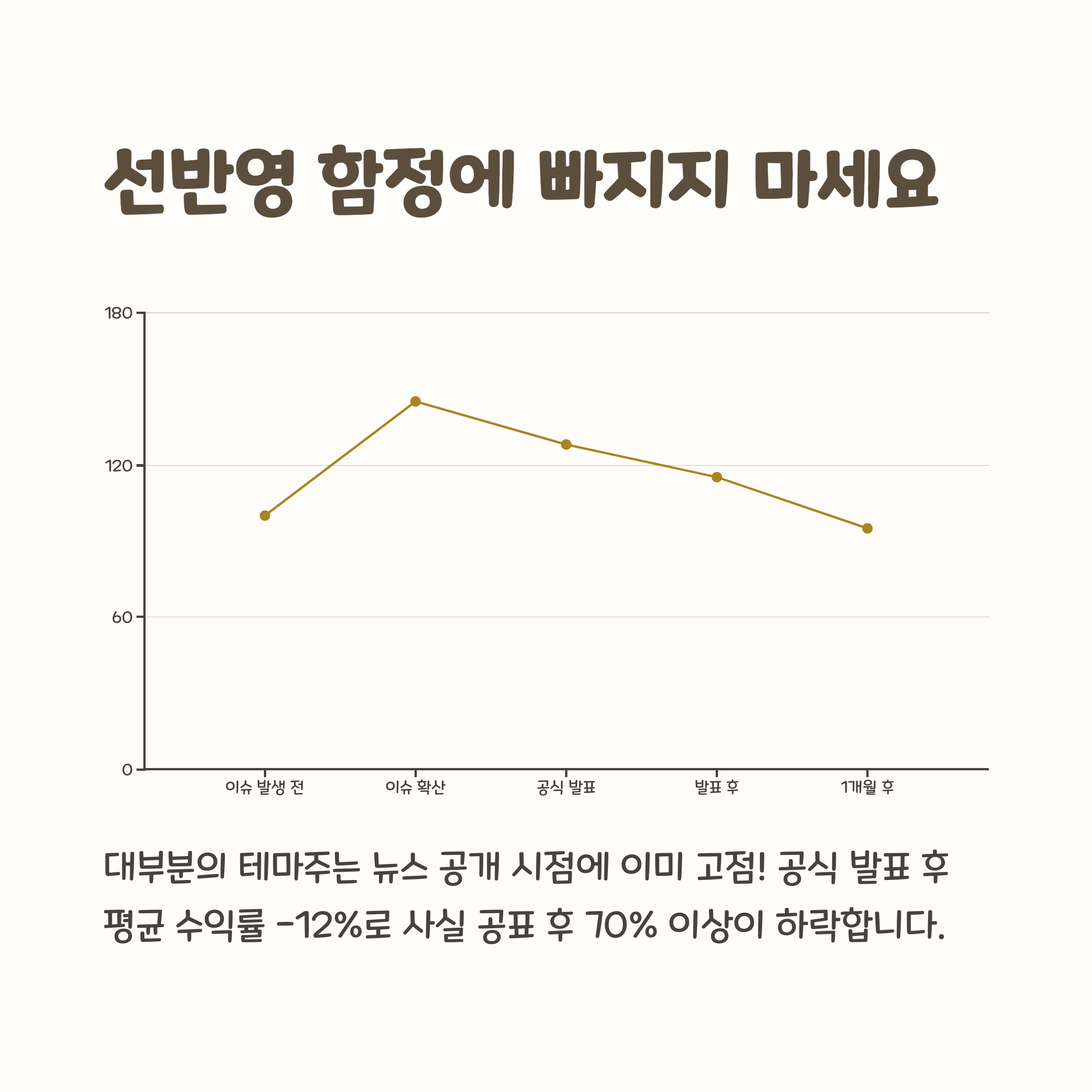 | 테마주 뉴스 선반영 유의 | 뉴스가 퍼지기 전이 가장 유리 | 전체 자산의 일부만 투자 |