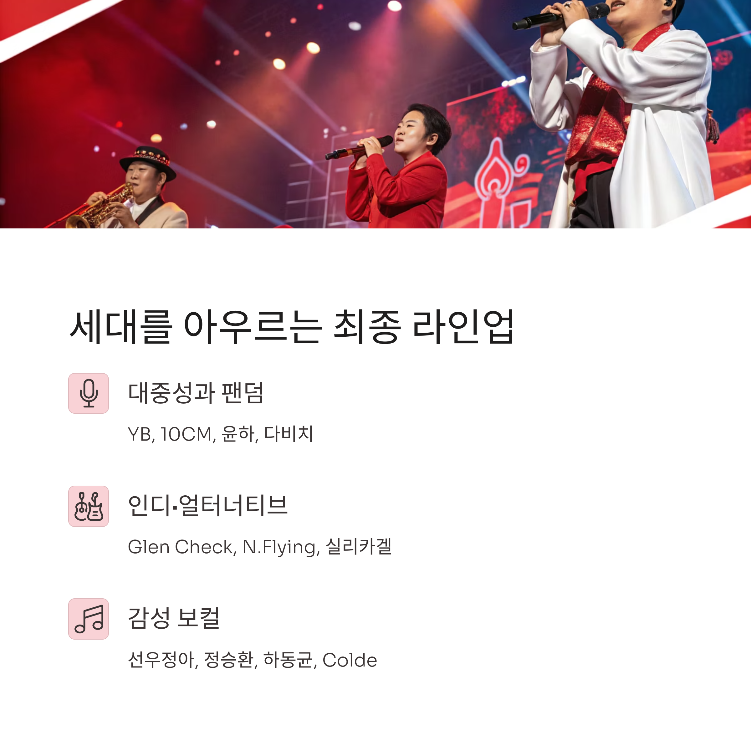 | YB, 10CM, 윤하, 다비치 | 록·발라드 | 대중성과 팬덤 모두 확보 |