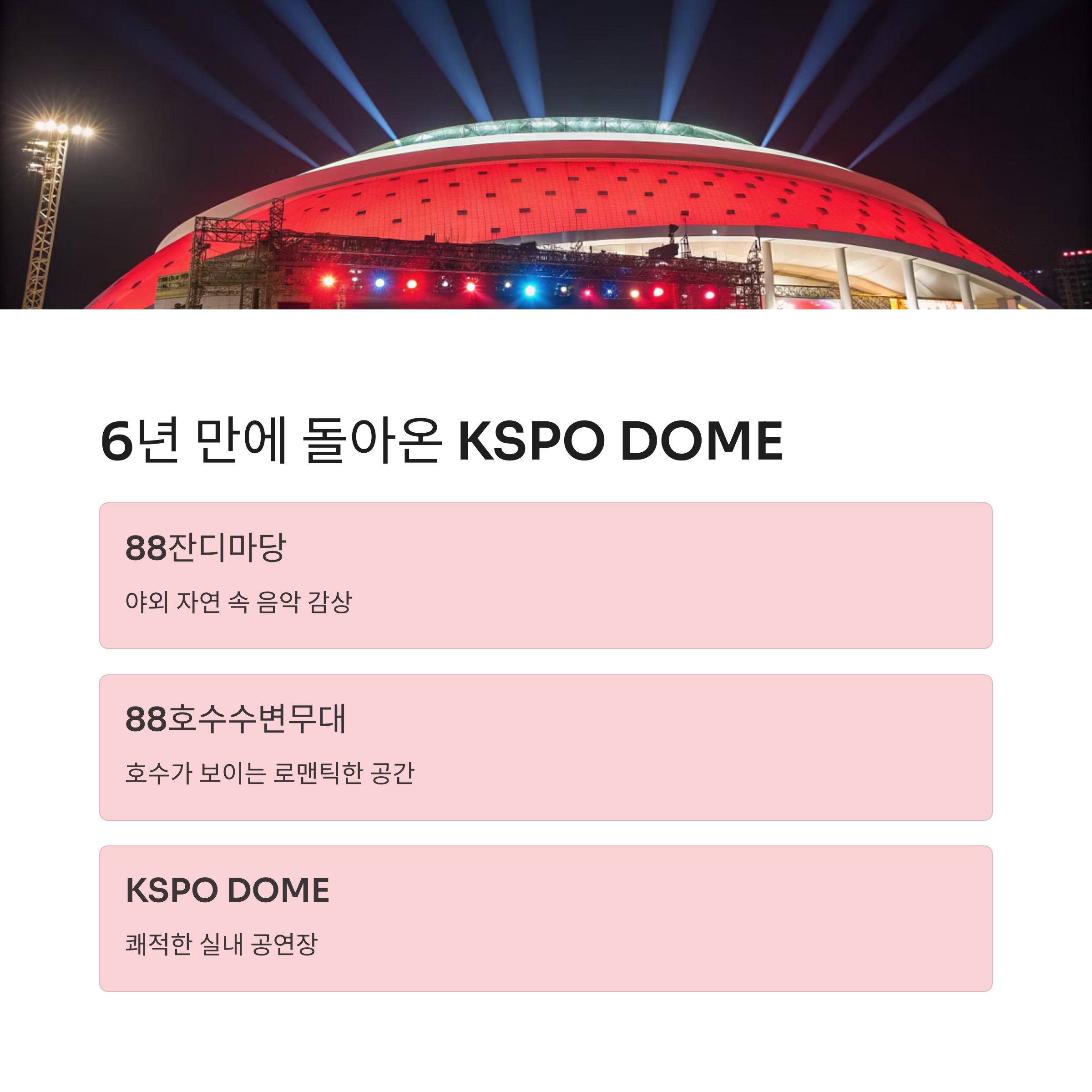88잔디마당, 88호수수변무대에 더해 KSPO DOME까지 총 3개 무대로 구성됩니다.