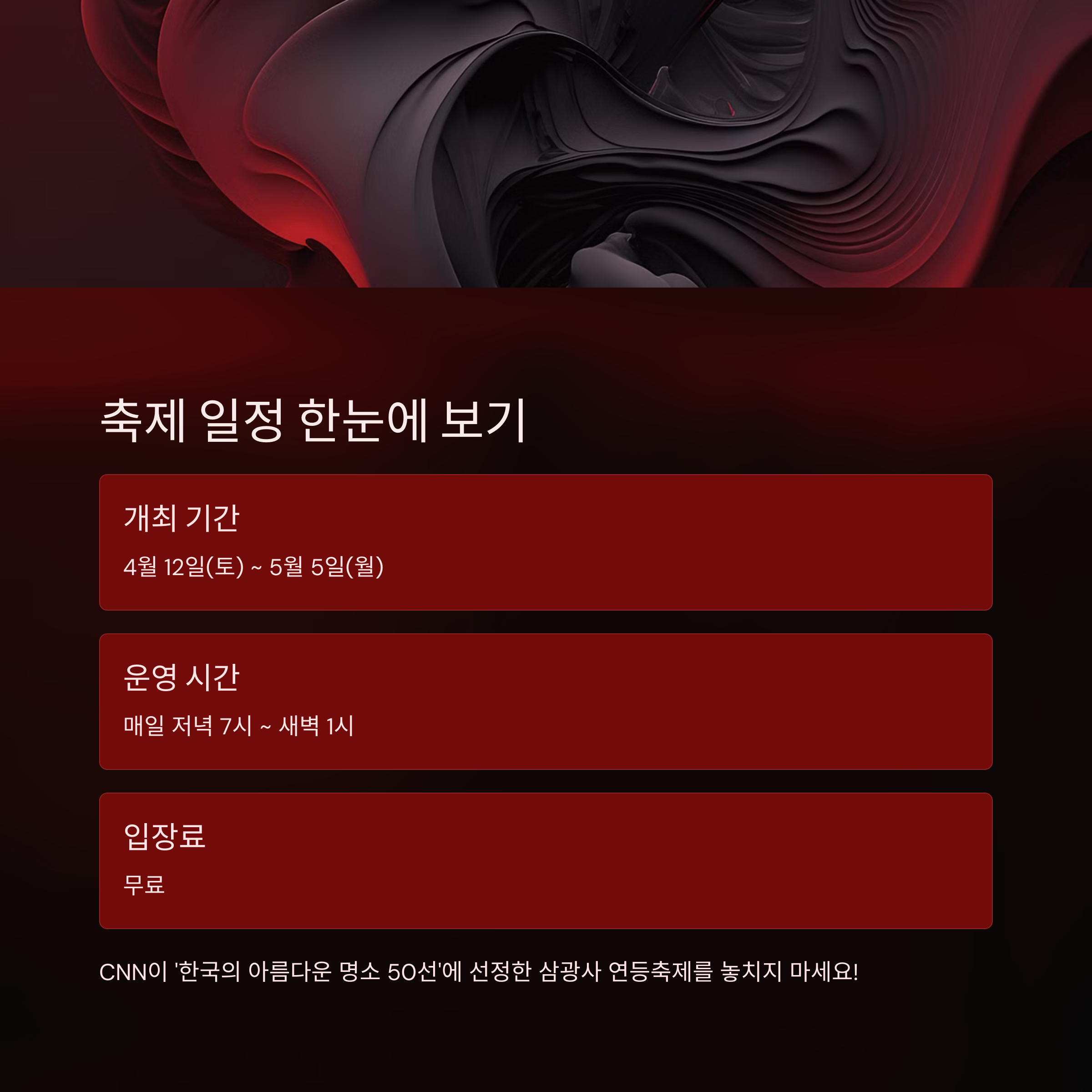 봄밤의 대표 행사입니다. 방문 계획에 꼭 참고하세요!