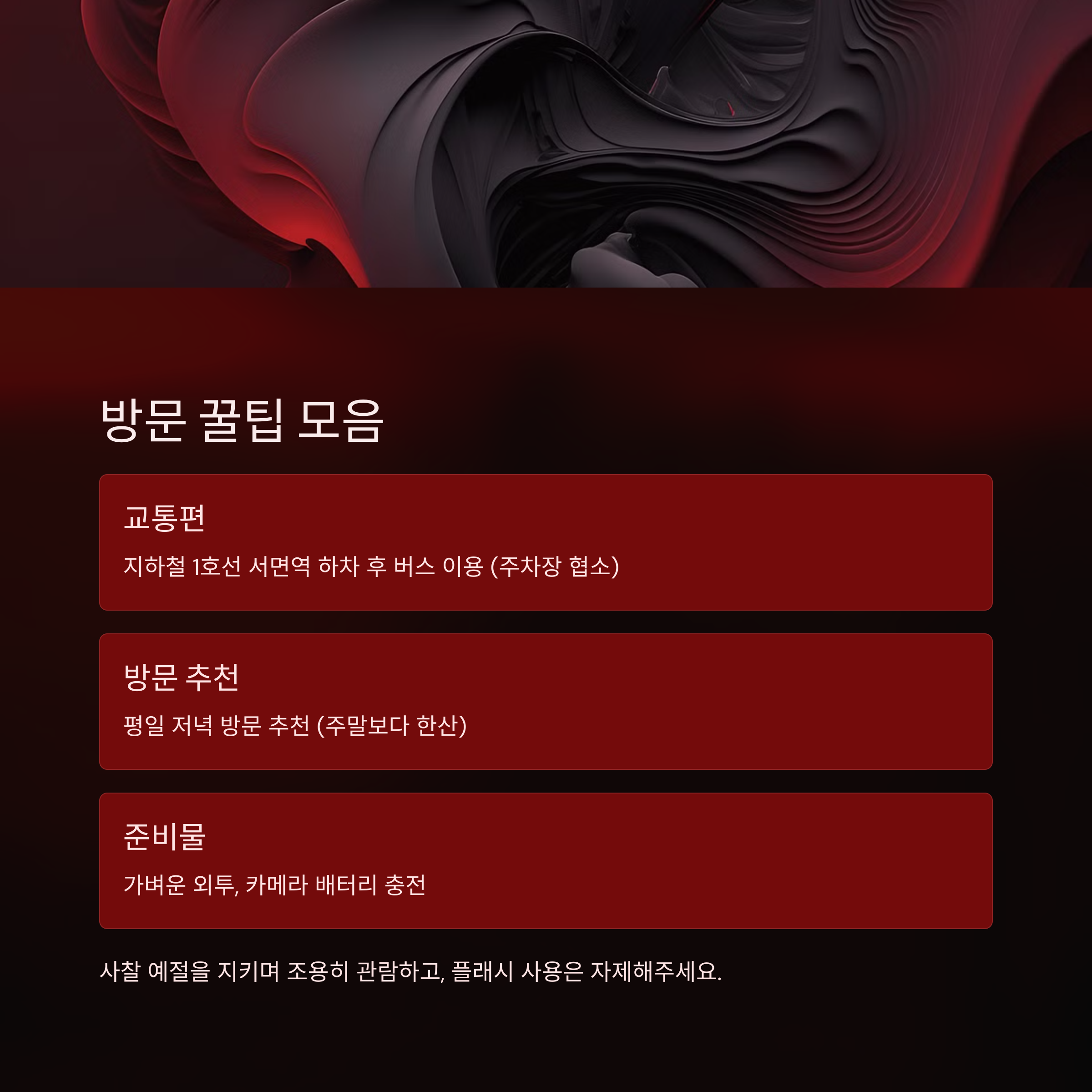 - 사찰 예절 지키기 (조용히 관람, 플래시 금지)