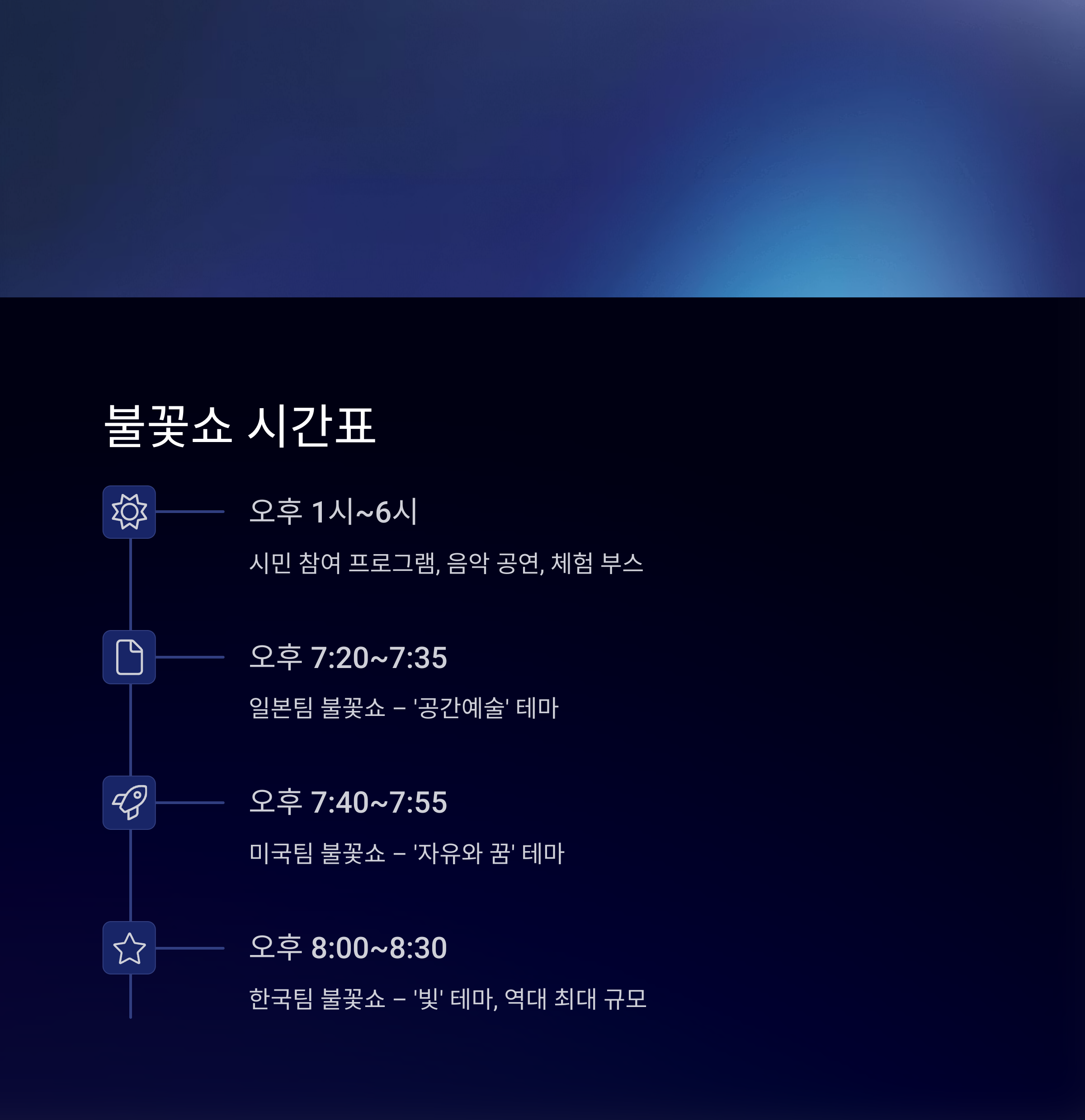 | 오후 8:00~8:30 | 한국팀 불꽃쇼 – ‘빛’ 테마, 역대 최대 규모 예고 |