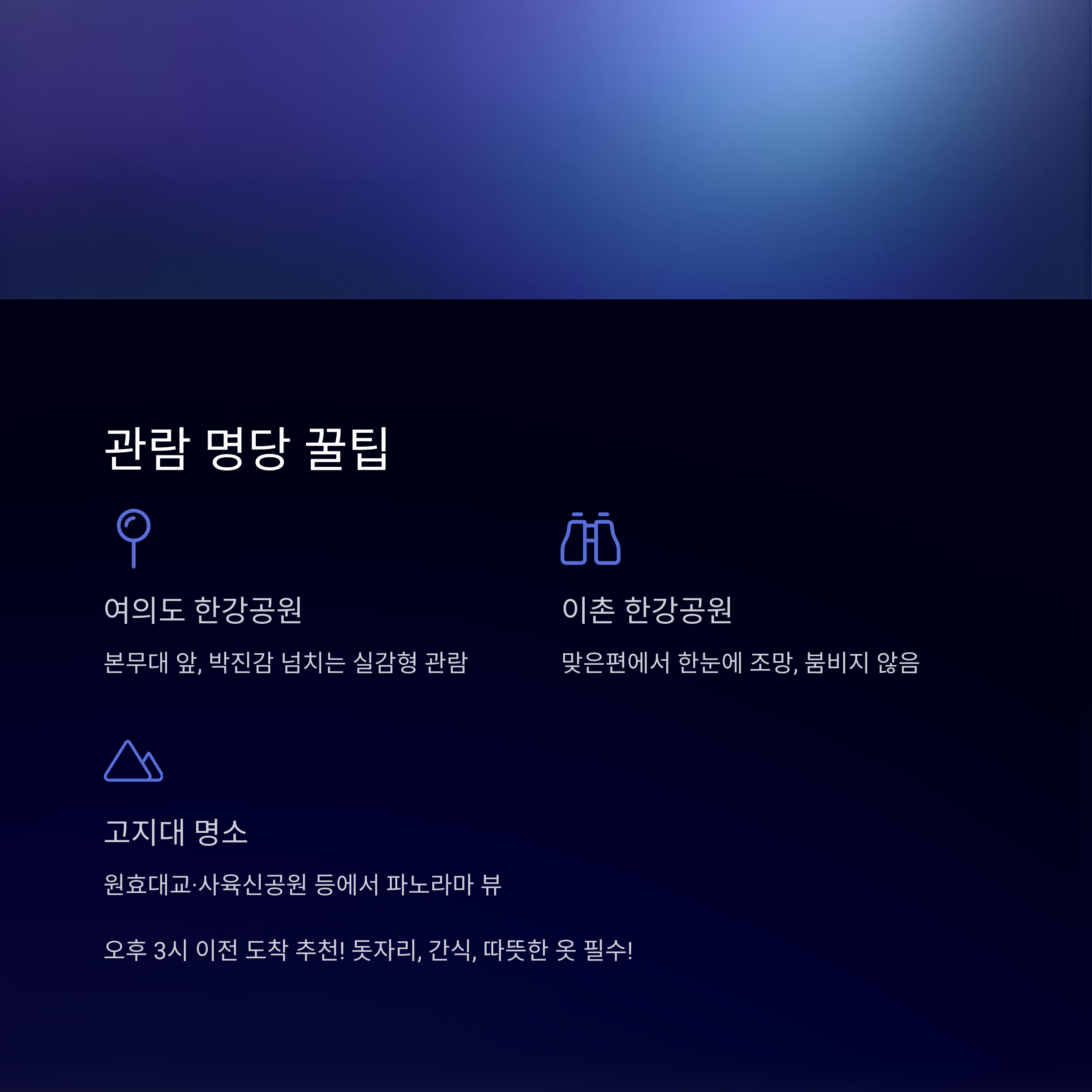 | 이촌 한강공원 (맞은편) | 한눈에 조망, 붐비지 않음 |