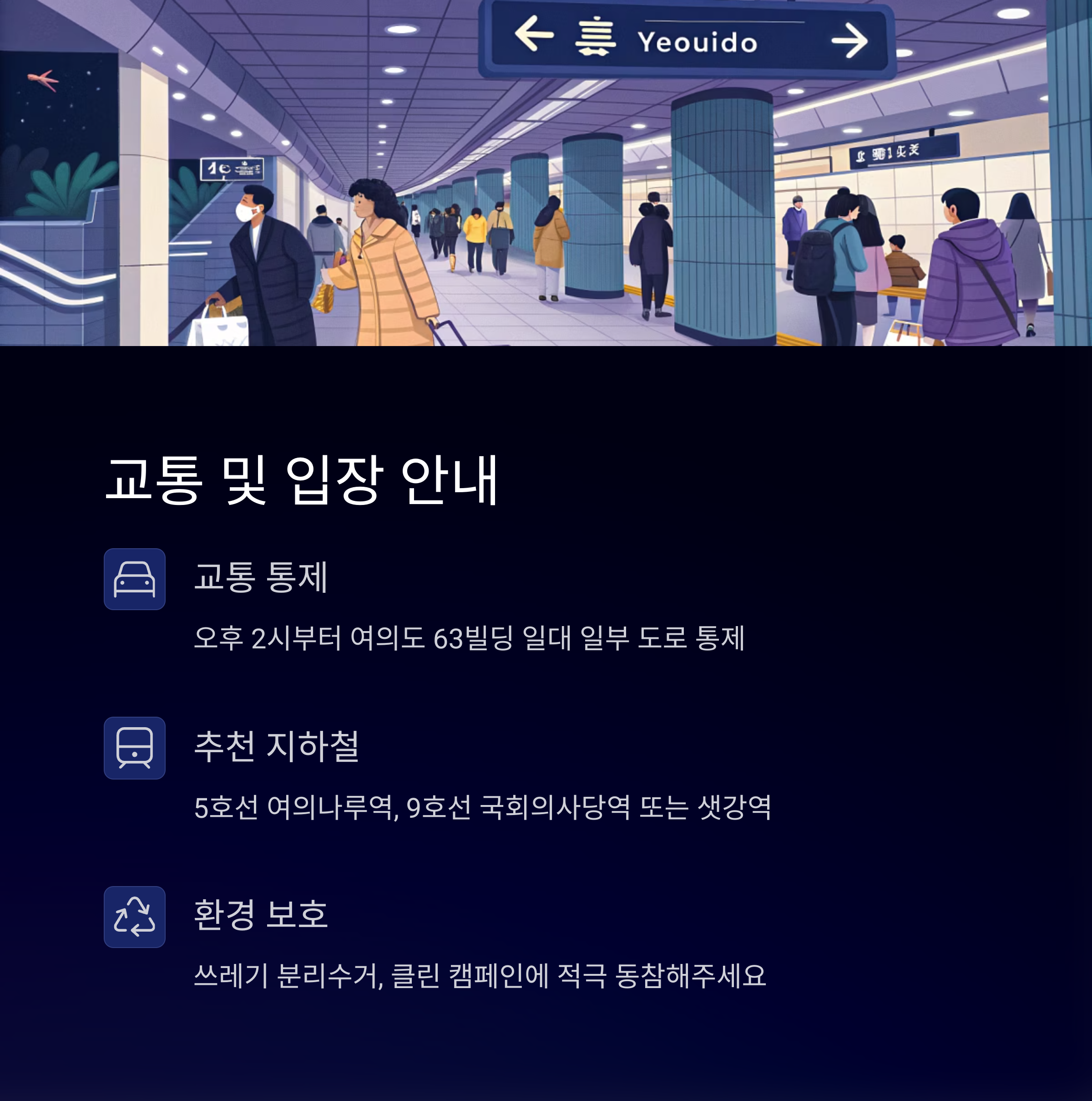 - 교통 통제: 오후 2시부터 여의도 63빌딩 일대 일부 도로 통제 예정