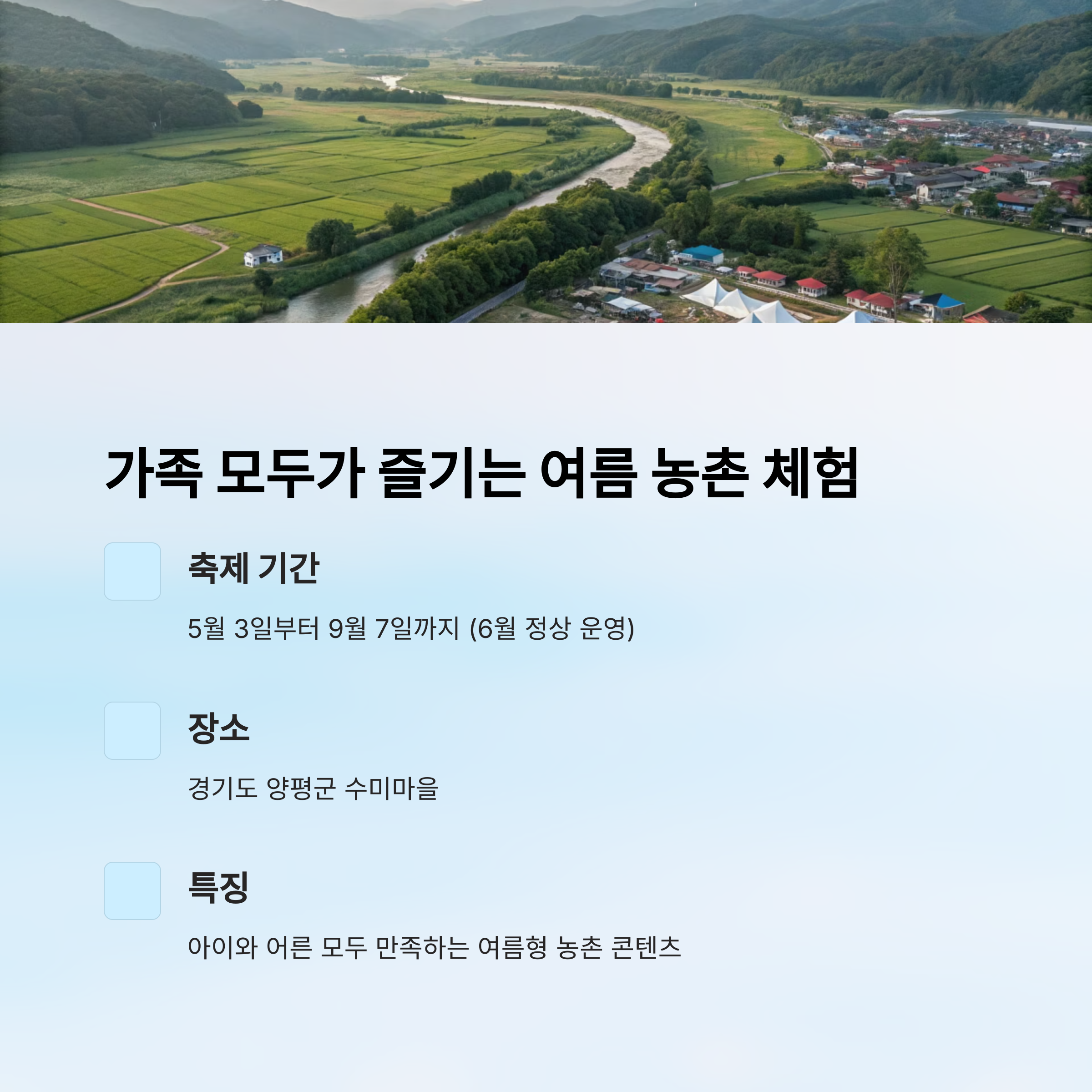 아이와 어른 모두가 만족할 수 있는 여름형 농촌 콘텐츠가 가득합니다.