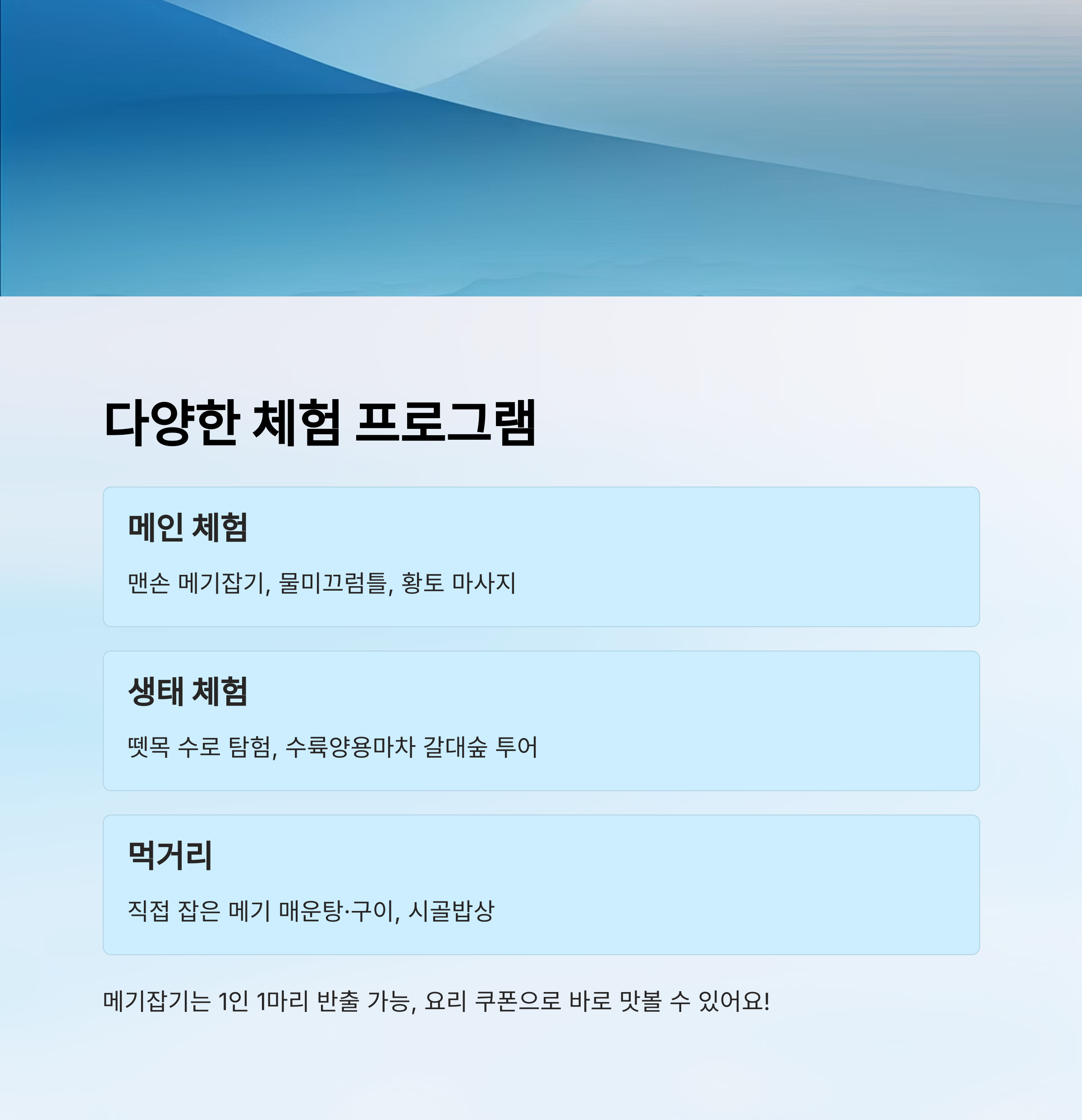 | 먹거리 | 직접 잡은 메기 매운탕·구이, 시골밥상 쿠폰 운영 |